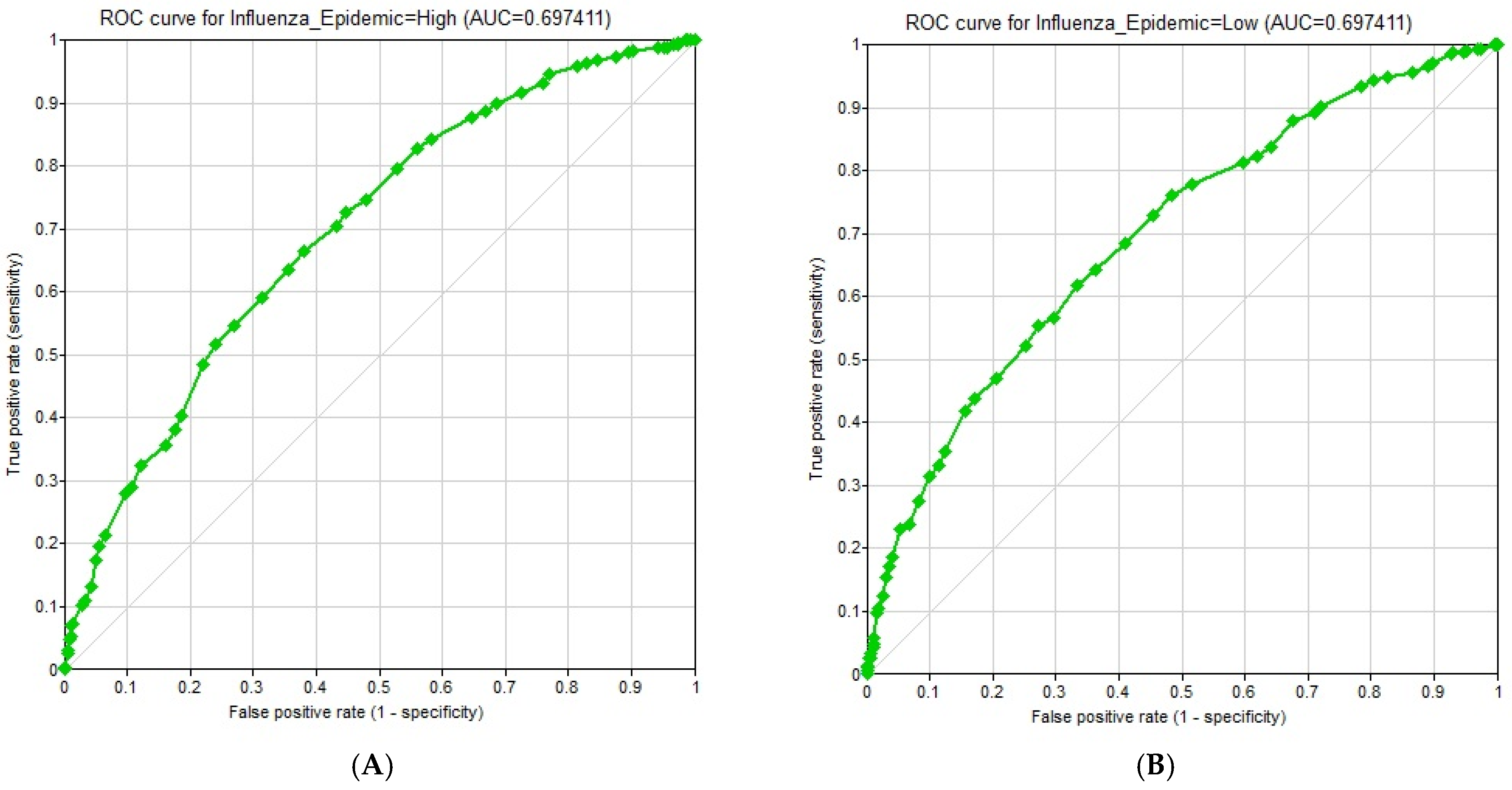 Figure 3. (A) ROC curve for influenza epidemic “High” (left), (B) ROC curve for influenza epidemic “Low” (right). The grey diagonal line indicates no better odds of detecting an influenza epidemic than random guessing; For a model to be useful, the green curve must stay above this diagonal line.
