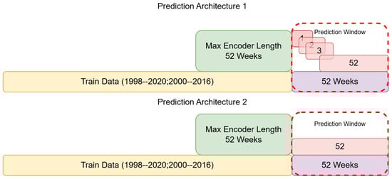 The TFT model was trained on the preprocessed dataset (Figure 1), partitioned into training, validation, and test sets to ensure the data used to train the model was different from that used to test it, allowing for robust and generalisable predictions and performance results. A rolling window validation strategy was adopted, facilitating the evaluation of the model’s performance over different time windows from 1 to 52 weeks ahead. The training data consists of weekly observations over 22 years, providing a robust dataset for learning patterns and trends. The model (Figure 2) processes these sequences to generate predictions for the subsequent 52 weeks. Two different prediction setups were used: (1) training and running 52 different models for each week to determine which prediction windows were most efficient, and (2) training one model to predict from 1 to 52 weeks. The latter is computationally cheaper and more generalizable but may lack accuracy for the larger prediction windows, as it has to only use the previous year’s data instead of also incorporating the cases predicted from previous weeks. The prediction window was divided into overlapping segments to allow the model to predict one week at a time, iteratively extending to a full year ahead. The previously predicted weeks were each used to update and predict the next week iteratively, so the model could rely on its own predictions to inform the following week to replicate a real-world application when data is not available for the prediction period. This approach ensures that the model can leverage recent patterns and trends effectively, enhancing the accuracy of the predictions.