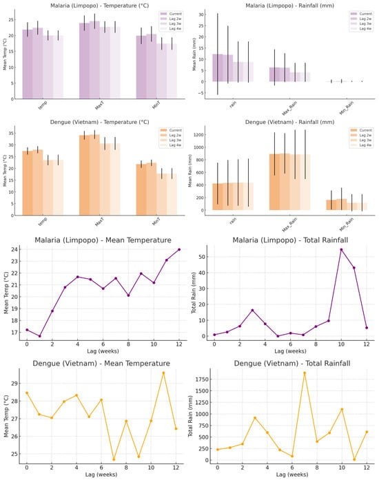Based on the model representations of the most important climate factors, temperature and rainfall are consistently highlighted. Hence, temperature, rainfall, and the maxima and minima for each were chosen to explore the climate–disease relationship. These were extracted to understand the model weights (what the model sees as the most likely magnitudes of temperature and rainfall at which risk for case incidence is highest) and inform the climate–disease dynamics. When malaria cases in Limpopo exceeded the 90th percentile, the mean temperature was approximately 22 °C, with maximum and minimum temperatures averaging around 27 °C and 17 °C, respectively. Total weekly rainfall during these high-case weeks averaged approximately 15–20 mm, with moderate maximum daily rainfall and low minimum daily rainfall values. For dengue in Vietnam, high-case weeks were characterized by higher mean temperatures of around 28 °C, with maximum and minimum temperatures averaging approximately 33 °C and 24 °C, respectively. Rainfall levels during high dengue weeks were substantially higher, with weekly totals exceeding 40 mm on average and markedly elevated maximum daily rainfall values. When examining two- and three-week lags (Figure 8), similar climate profiles were observed, with slightly lower temperatures and rainfall magnitudes at the three-week lag, where relative risk (RR) also showed localized peaks. The climate magnitudes were lower. For malaria, the mean temperature was approximately 0.7 °C lower (21.3 °C), and the rainfall was around 13.6 mm. For dengue, the mean temperature was lower too by 0.6 °C (27.4 °C), and the weekly rainfall was approximately 36.9 mm. However, a broader analysis of all weeks revealed that RR was highest at specific climate thresholds (Figure 7): 21.5 °C and 17.5 mm for malaria (RR ≈ 1.27–1.28), and 24.5 °C and 182.5 mm for dengue (RR ≈ 0.98–1.88), as shown by RR curves.