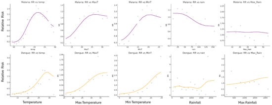 The RR graphs for malaria (purple) and dengue (orange) indicate the temperature, MaxT, MinT, rain, and Max_Rain magnitudes and the corresponding risk for those magnitudes for each disease. Lines are smoothed relative risk, and the points are the raw relative risk data. The peaks of the curves indicate the climate magnitudes associated with the highest RR, thus the highest risk of high disease incidence.