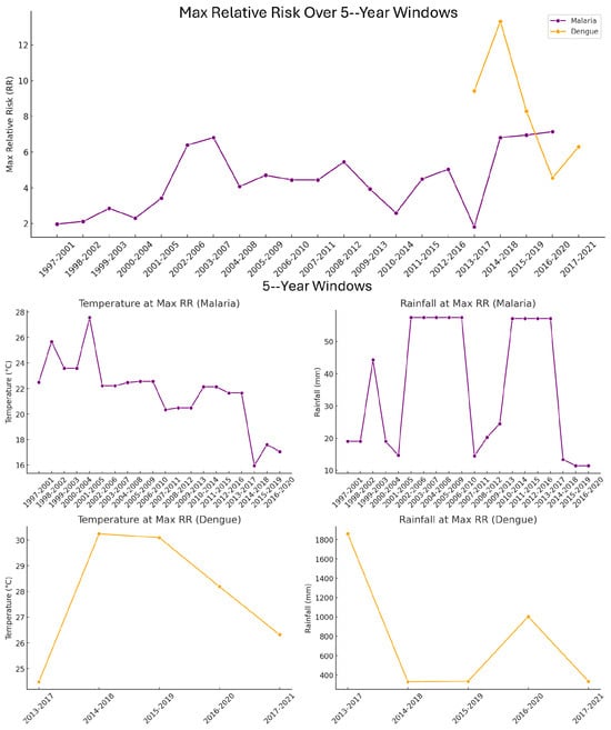The observed temporal variation in climate–disease associations supports the presence of non-stationarity in the relationship between climate variables and disease risk. Specifically, the temperature and rainfall levels associated with the highest relative risk (RR) of malaria and dengue shifted over time (Figure 10), indicating that the influence of climate on disease incidence is not fixed. For malaria, RR peaked at lower temperatures (20–23 °C) and moderate rainfall (20–70 mm), but the exact combination of risk-enhancing conditions varied across decades. In contrast, dengue exhibited consistently higher temperature thresholds (28–30 °C) and substantially higher rainfall (often exceeding 1000 mm) as the climatic conditions most associated with high RR. However, even within dengue data, the precise risk-maximizing temperature–rainfall combination changed slightly between five-year windows. To ensure this non-stationarity was accounted for, RR was also calculated using moving five-year windows, which revealed further shifts in high-risk conditions not captured by broader decadal averages (Table 4).