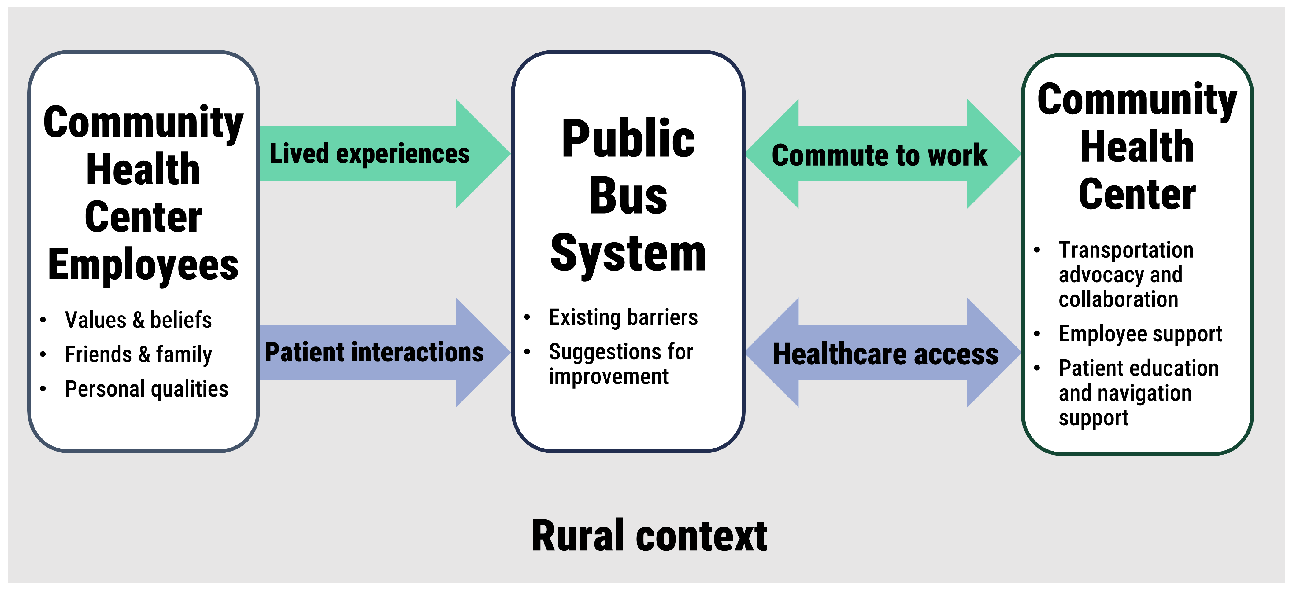 - Employees and patients faced multiple barriers to using the bus to access the community health center.