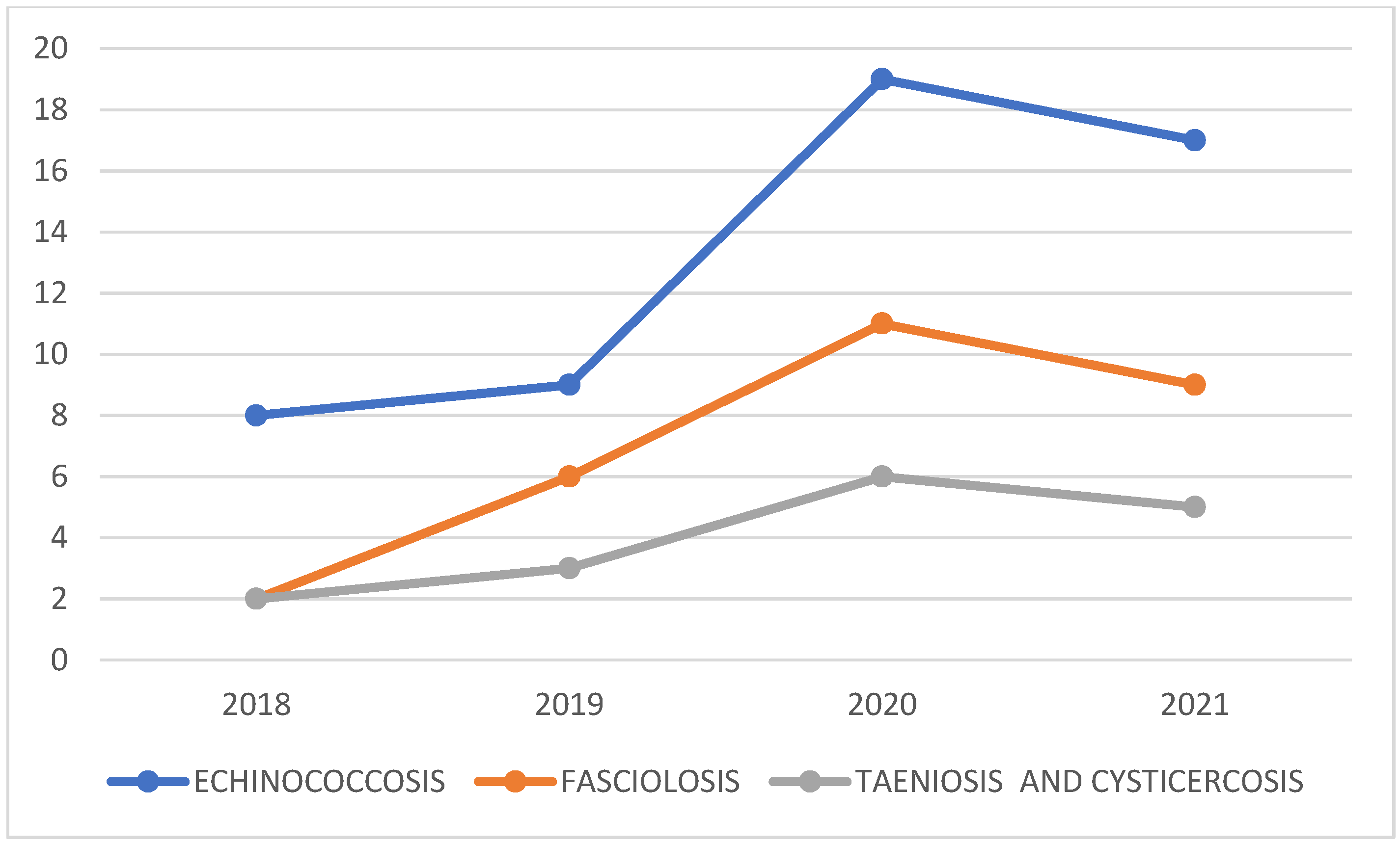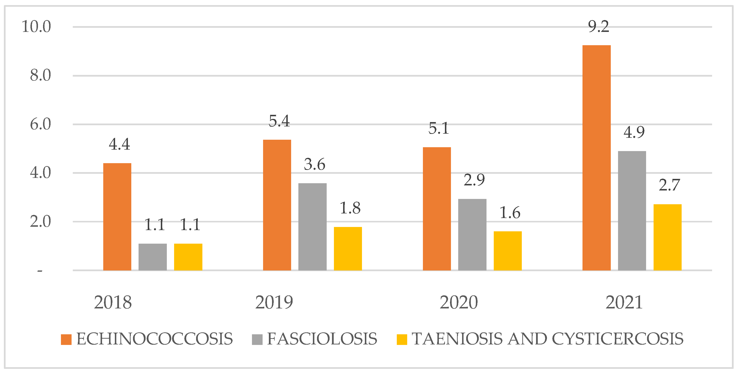 - Echinococcosis showed the highest prevalence, peaking in 2021 (9.2%) compared with 2018–2020 (4.4–5.4%) (Figure 2).
