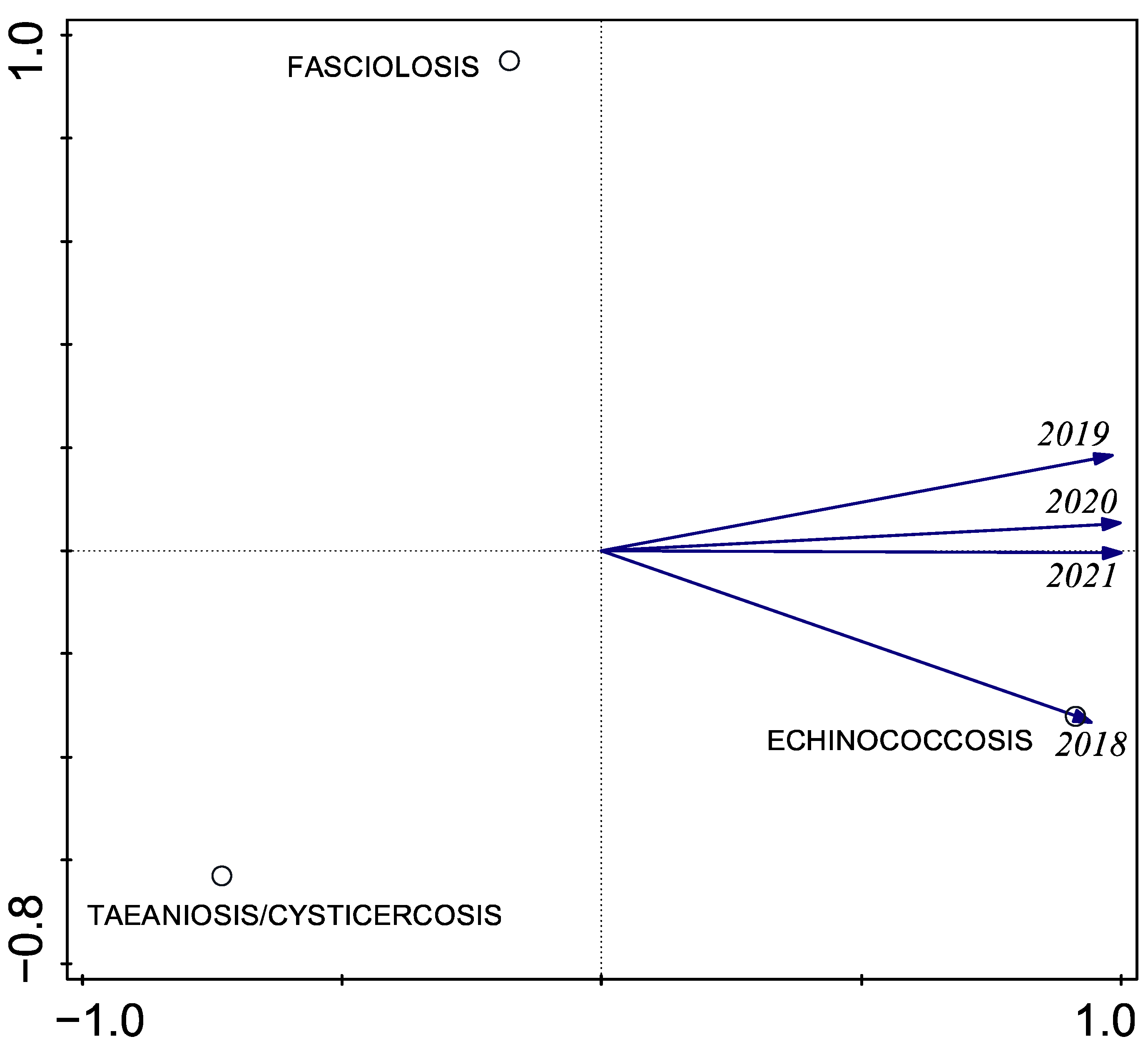 - The taeniosis/cysticercosis complex exhibited the lowest prevalence throughout, increasing modestly from 1.1% (2018) to 2.7% (2021).