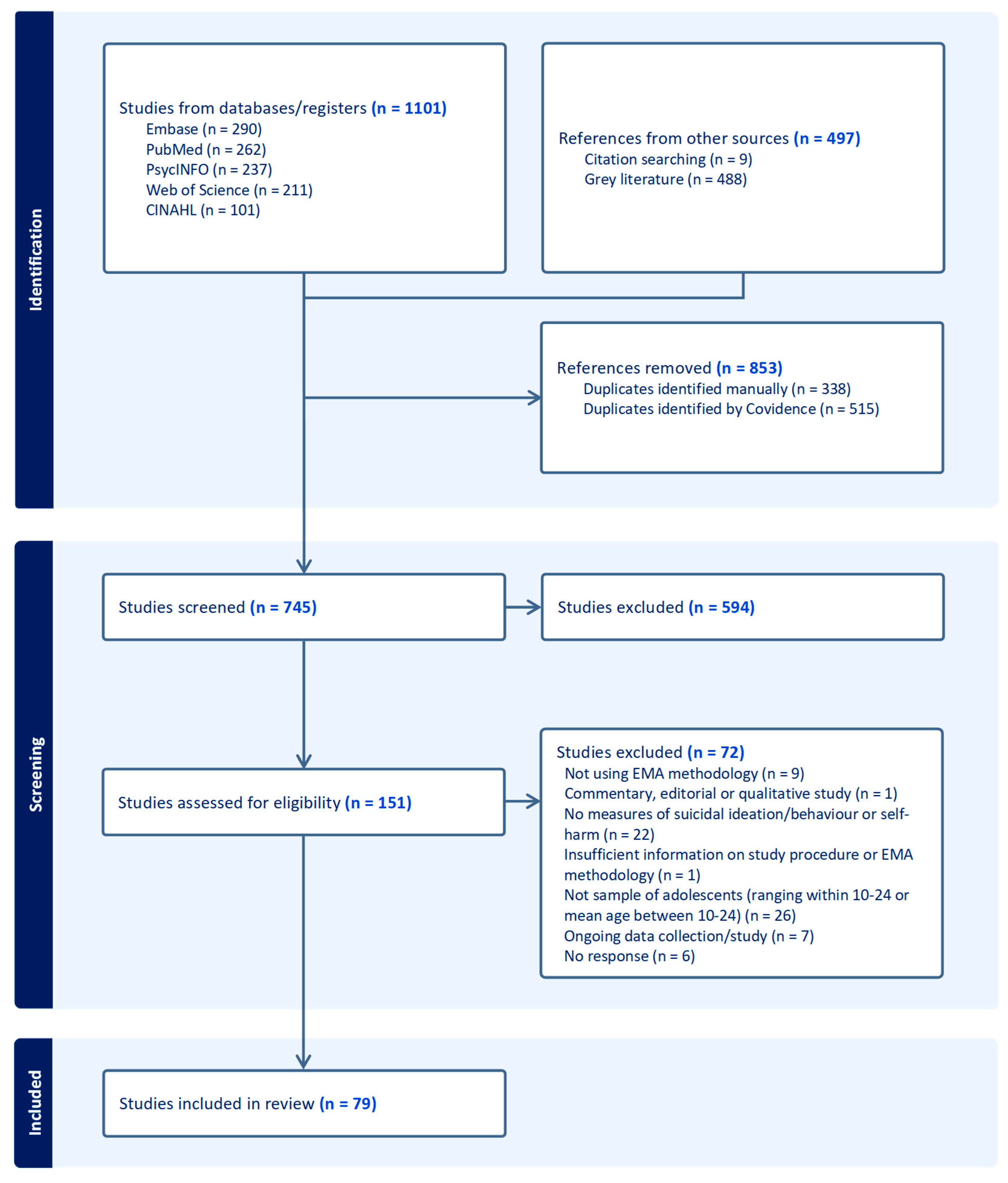 | Jiang 2023 [76] | 106 young people with suicidal thoughts | 20.93 (18–25) | 81.1% | 8 weeks of signal (4/day) sampling with mobile phone | 62.1% | Suicidal Ideation (2 items based on [54]) | The EMA and wearable sensor protocol were feasible and acceptable in this sample. Adherence decreased over time. Greater baseline levels of hopelessness were associated with higher EMA adherence. Previous-day suicidal ideation predicted lower wearable sensor adherence on the next-day. |
