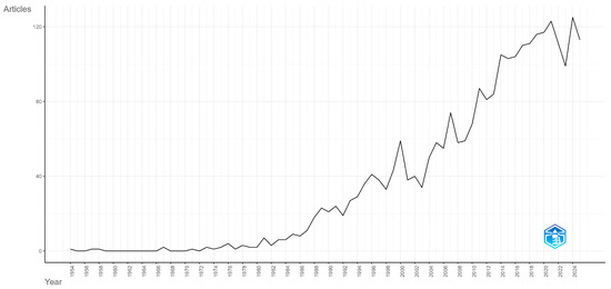 The final dataset comprises 2607 documents published across 916 sources over the period 1954–2025 (the last year not finished yet), with an annual growth rate of approximately 6.9% and a mean document age of 13.8 years. This indicates a long historical tail and sustained recent expansion. Authorship is relatively broad; 12,997 unique authors contributed, with a typical paper consisting of 6.2 co-authors. Regarding authorship, 253 of the papers were single-authored, and approximately 10.2% involving international co-authorship, which points to moderate cross-border collaboration. Topic diversity is reflected in the vocabulary, based on keywords, 5125 distinct terms were found.