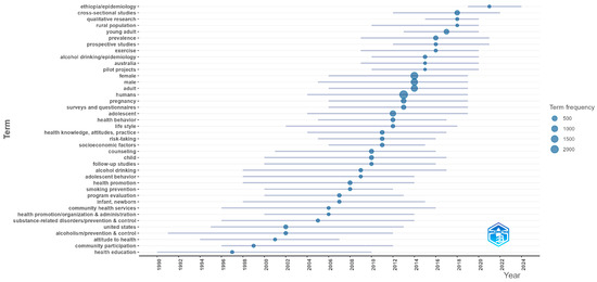 Early works shown in Figure 2 emphasized health education, community participation, and broad health promotion with organization and administration themes. Through the 2000s, topics concentrated on alcoholism prevention and control, community health services, and program evaluation, alongside youth-oriented terms (adolescent behavior, school with a child focus). From 2010 onward, the vocabulary broadened and methods diversified: frequent terms include surveys and questionnaires, health behavior, risk-taking, follow-up studies, and counseling; design tags such as cross-sectional, prospective, and qualitative research became prominent. Recent years show more epidemiology and prevalence labels, population tags (young adult, female and male, pregnancy), contextual terms (rural population), and geographic markers (e.g., Australia, Ethiopia), indicating wider settings and regions.