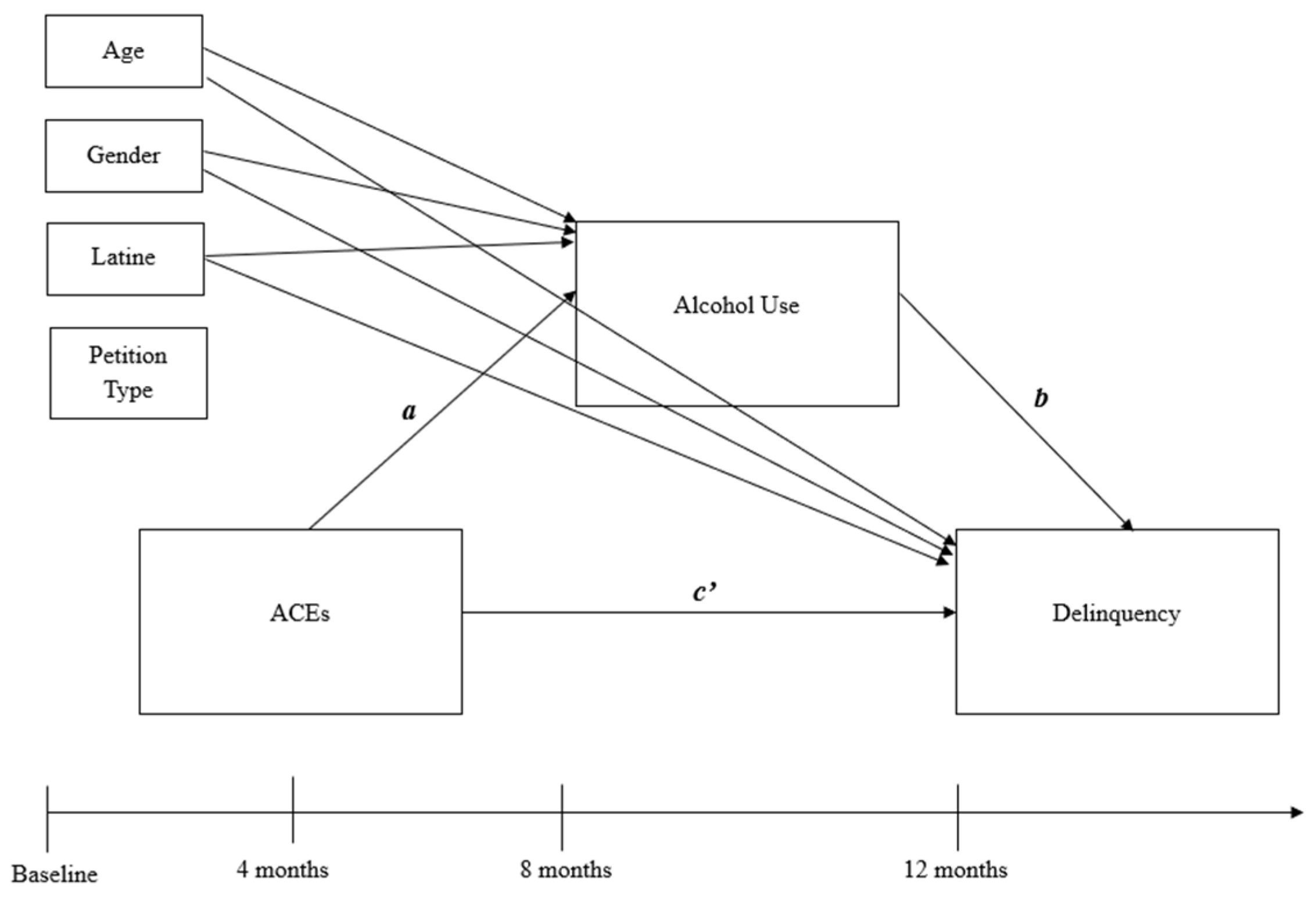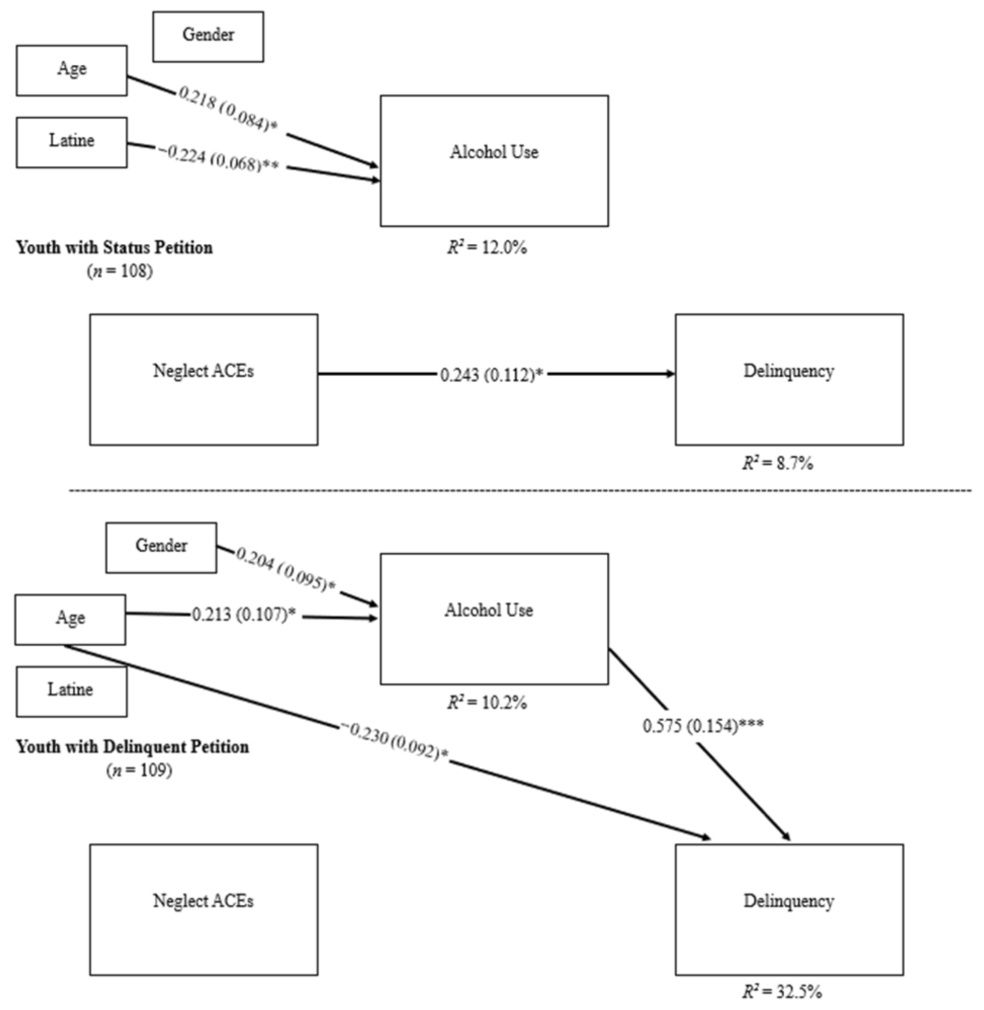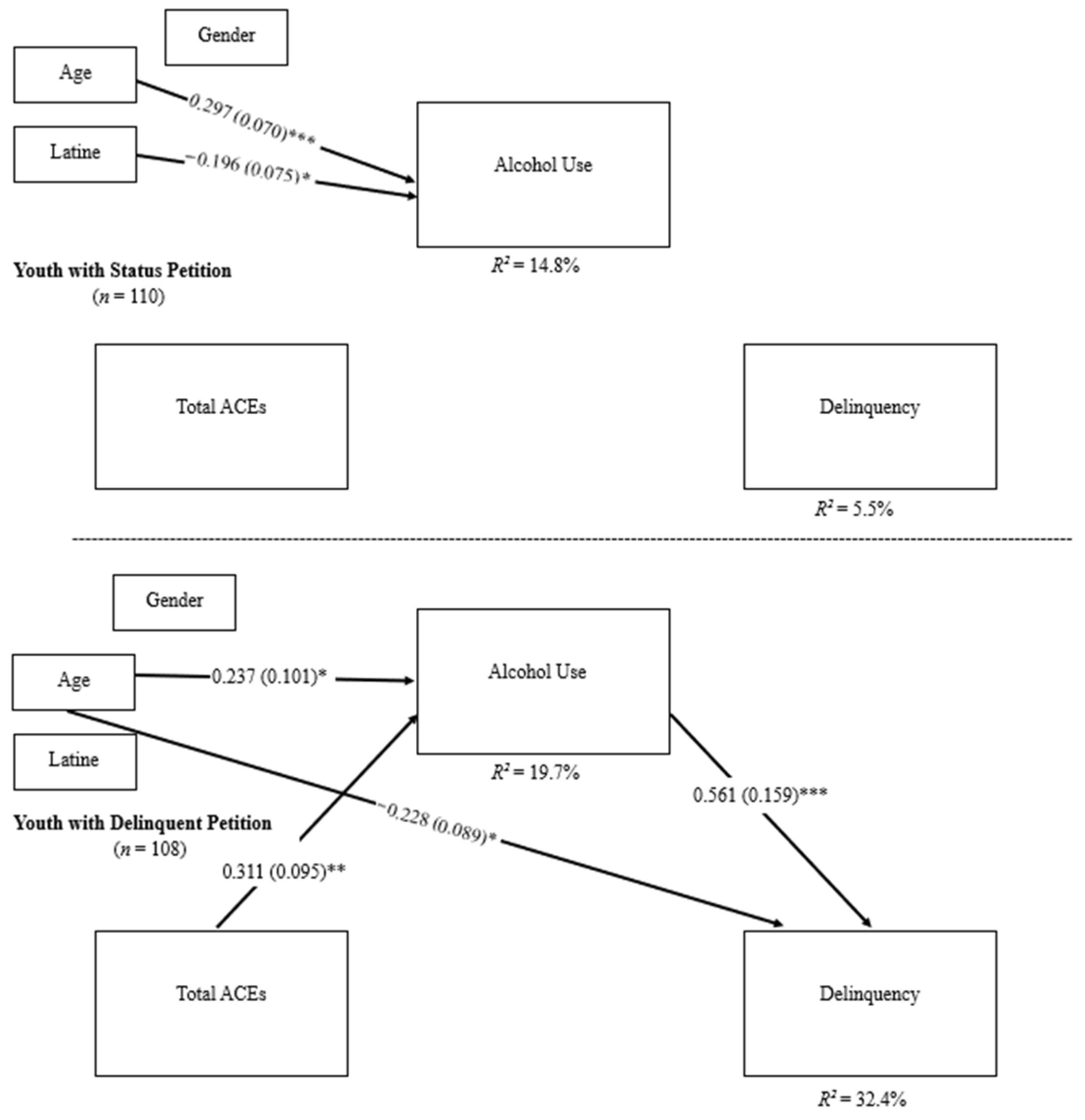 | Model | Petition Type | ACE → Alcohol | Alcohol → Delinquency | ACE → Delinquency | Indirect Effect |