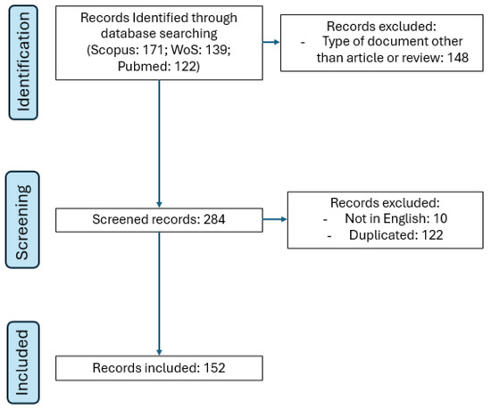 The initial search identified 432 articles. Specifically, the PubMed database generated 122 articles, Scopus returned 171 articles, and Web of Science listed 139 articles. After applying a screening based on document type, the eligible articles resulted in a total of 284. Ten of these articles were excluded for not being in English. The 274 articles were consolidated into a single set using R, and 122 duplicate articles were identified and removed, resulting in 152 articles, ensuring that the subsequent analysis was carried out on a coherent and relevant data set.