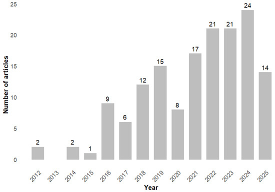 Figure 2 shows that 2012 was a milestone in publications on the subject, with a modest start in scientific production. Between 2012 and 2017, the number of articles published remained below 10 per year, and there was no production on the subject in 2013. As of 2018, there has been a significant increase in the volume of publications, culminating in a peak in 2024, with 24 articles published. This increase indicates a growing recognition of the relevance of EHL. By 7 July 2025, 14 publications had already been registered. This reinforces the continued importance and growing interest of the academic community in the subject.