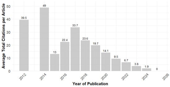 Figure 3 shows the evolution of average annual citations per article between 2012 and 2025. It was calculated for each year by summing the total citations of all articles published in that year and then dividing by the number of articles published in the same year. It is possible to observe a significant peak in 2014, which is a year with few publications that have made a large impact, considerably raising the average. After 2014, there was a sharp drop in 2015, followed by a recovery between 2016 and 2017, and a gradual decline from 2018 onward. As shown in the upcoming Figure 8, the most cited article is from 2017 [1]. This oscillation may reflect the fact that EHL is a relatively new and still developing field.