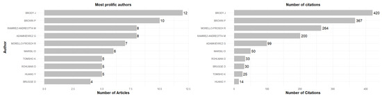 The most relevant authors in terms of the number of publications in the field of EHL include Brody J., who leads with 12 published articles, followed by Brown P., with 10 publications. Ramirez-Andreotta M. and Adamkiewicz G. have 8 articles each. Morello-Frosch R. and Marsili D. have 6 and 5 publications, respectively. These authors represent the main contributors to the development of EHL research. This productivity data is shown in Figure 5, while their specific impact and research consistency are detailed in the following subsections.