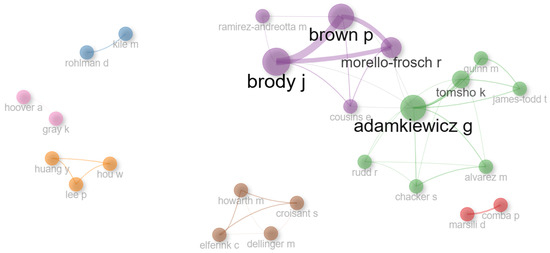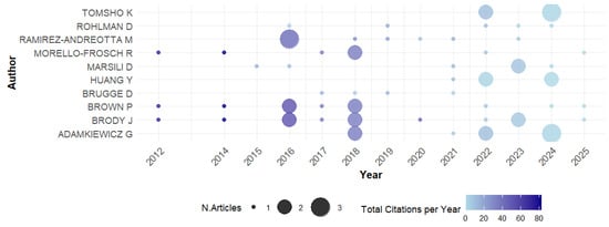 An analysis of the authors’ output over time reveals different patterns of consistency and involvement with the field of EHL. Figure 6 shows the academic output over time of the most prolific authors. Brody J. shows the most consistent production, with regular publications from 2012 to 2023, standing out as one of the most prolific and active authors throughout the period analyzed. Brown P. also maintains a constant production, starting in 2012 and continuing until 2022, although there has been a slight reduction in the frequency of publications in recent years. Ramirez-Andreotta M. shows a pattern of high activity from 2016, with significant peaks in production between 2016 and 2018, and remains active until 2023. Marsili D. and Comba P. began publishing in 2015 but have not maintained the same regularity over the years, resulting in sporadic production in subsequent years. Adamkiewicz G. started publishing more recently, in 2018, and has shown a progressive increase in publications.