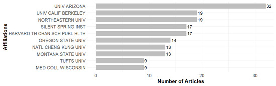 The authors who publish in EHL are affiliated with institutions that play a key role in advancing and disseminating knowledge in the field. An analysis of the most relevant affiliations, presented in Figure 7, reveals that the University of Arizona stands out as the most productive institution, with 32 publications, leading the way in terms of academic contributions. Other prominent institutions include the University of California, Berkeley, and Northeastern University, with 19 publications each.