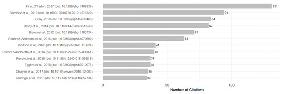 The journals Environmental Health Perspectives and Environmental Justice were pioneers in the production of articles related to EHL, particularly the articles by Brown et al. (2012) [10] and Ramos et al. (2012) [18], respectively. From 2016, the International Journal of Environmental Research and Public Health has begun to publish more consistently on the subject, with the article by Ramirez-Andreotta et al. (2016a) [2], and despite its late start compared to other journals, it quickly consolidated itself as the most prolific, especially from 2021. Environmental Research followed this trend in 2017, with the article by Ohayon et al. (2017a) [19] shows its involvement with the subject. In 2018, BMC Public Health also stood out with the publication of the article by Cláudio et al. (2018a) [20].