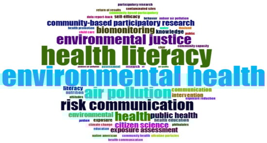 The interdisciplinary nature of the research field is reflected in the journals in which the research is published (Figure 4), bringing together the fields of environmental science and public health. Moreover, regarding the interdisciplinary nature of EHL research, the transposition of citizen science concepts and approaches deserves to be highlighted. In fact, the advancement of EHL is directly linked to the practice of reporting results in exposure studies, strengthening community engagement, and promoting behavioral changes aimed at mitigating risks [8,9,10]. The convergence of growth indicators, co-citation networks, and thematic shifts reveal that the field is moving towards community-engaged research and environmental justice frameworks. This can be seen through the use of different terms referring to communication and interaction between researchers and communities in various thematic clusters, such as data report-back, participatory research, health communication, citizen science, and community-based participatory research (Figure 12 and Figure 14).