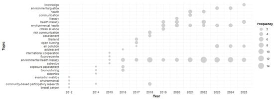 The topic trend analysis shows the most frequent keywords over time, revealing the usage of certain words during different periods. As presented in Figure 10, there has been an expansion in the number of topics over the years. Topics such as Environmental Health Literacy, environmental health, health literacy, and air pollution consistently appear over the years, representing the conceptual pillars of this area of study. The most recently discussed topics include environmental justice, knowledge, and communication; they can be viewed as directions in this area of research.