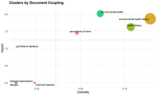 The thematic map (Figure 13) categorizes the distribution of the main research themes into four groups based on their degree of development and centrality in the field. It allows for the identification of the themes that drive the research in the field, as well as the conceptual shifts [16]. The motor themes, which play an essential role in advancing research and are central to the ongoing development of the field, are in the first quadrant [21]. These themes drive the research in this field and include environmental health literacy and environmental health.