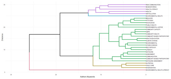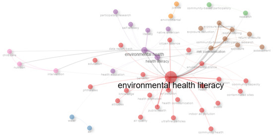 In Figure 14, the green cluster represents the core of the research in environmental health literacy. Within this cluster, it is possible to observe several subgroups covering participatory methods, which involve topics such as community health, community-based participatory research, health education, and citizen science; assessment of exposure to environmental risks, which encompasses themes such as exposure, assessment, and communication; and another subgroup involving fundamental concepts of health literacy, uniting knowledge, attitudes, behaviors, public health, and environmental justice.