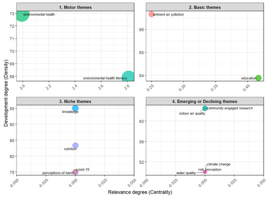 Emerging or declining themes located in the fourth quadrant include topics such as community-engaged research, indoor air quality, climate change, risk perception, and water quality.