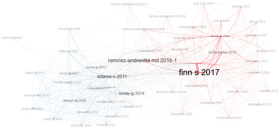 The red cluster is led by Finn & O’Fallon (2017) and Ramirez-Andreotta et al. (2016a) [1,2], highlighting the conceptual definition of EHL and its impact on empowering communities to face environmental risks, such as pollution and exposure to toxic substances. This group of articles focuses on the dissemination of environmental information to promote awareness and collective action, underlining the importance of education and community empowerment for public health and the environment.