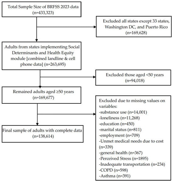 The data for the current study comes from the Districts of Columbia, 33 US states (Alabama, Alaska, Arizona, Arkansas, California, Connecticut, Delaware, Georgia, Hawaii, Idaho, Illinois, Indiana, Iowa, Kansas, Louisiana, Maine, Massachusetts, Minnesota, Mississippi, Missouri, Montana, Nevada, New Hampshire, New Jersey, New Mexico, North Carolina, North Dakota, Rhode Island, South Carolina, Utah, Virginia, West Virginia, Wisconsin) and one US territory (Puerto Rico) that administered the SDHE module in their 2023 BRFSS survey [36]. After excluding respondents from states that did not administer the SDHE module (n = 169,628) and individuals younger than 50 years (n = 94,018), the sample included 169,677 adults aged ≥50 years residing in selected US states and one territory. We further excluded observations with responses of “refused” or “don’t know/not sure,” or with missing values in the outcome, key predictor variables, or covariates. The final analytic sample included 138,614 adults aged ≥50 years. Figure 1 shows details of this study sample.