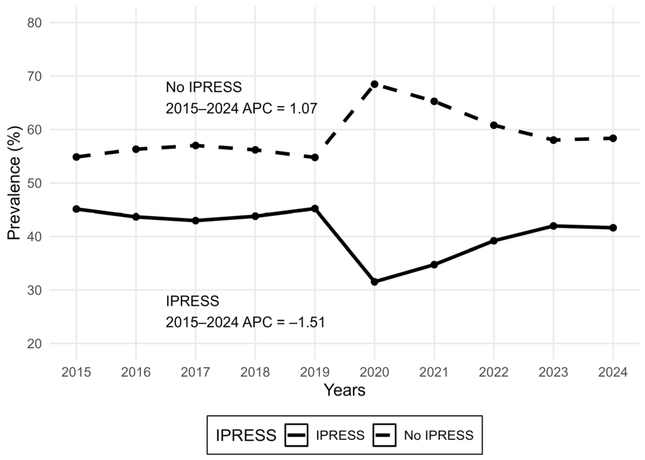 Figure 1). Joinpoint regression identified no statistically supported joinpoints over 2015–2024; accordingly, the AAPC equaled the single-segment APC, corresponding to an average annual increase of +1.07% for non-use and an average annual decrease of −1.51% for IPRESS use (