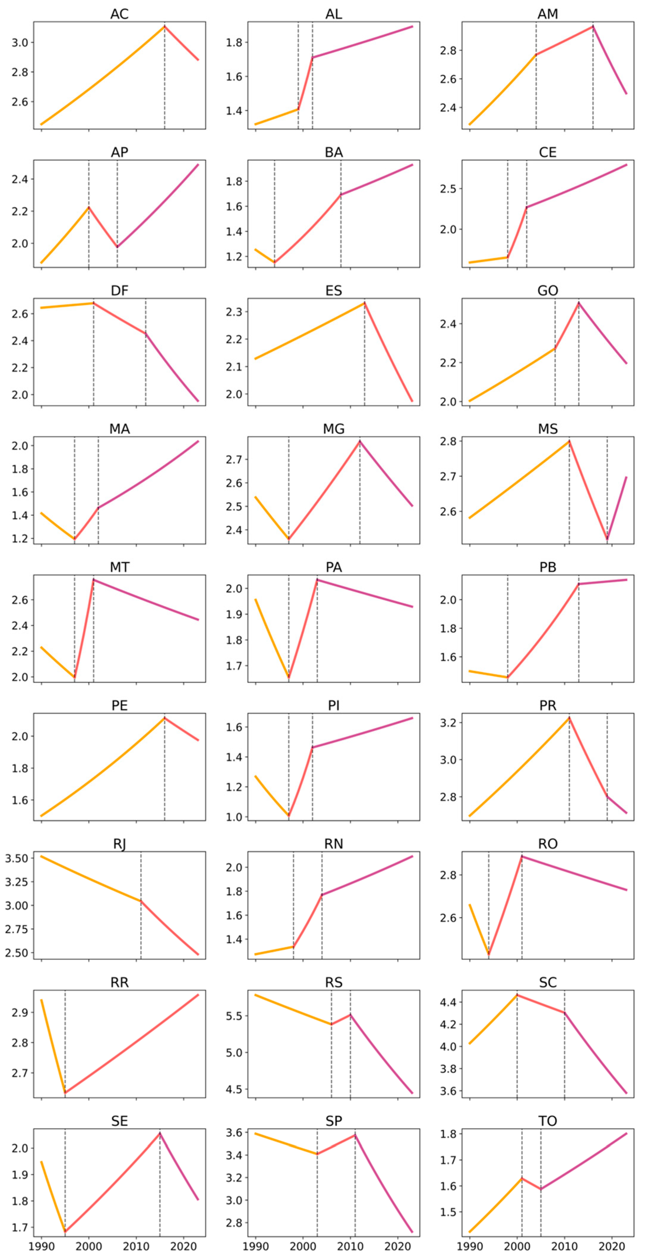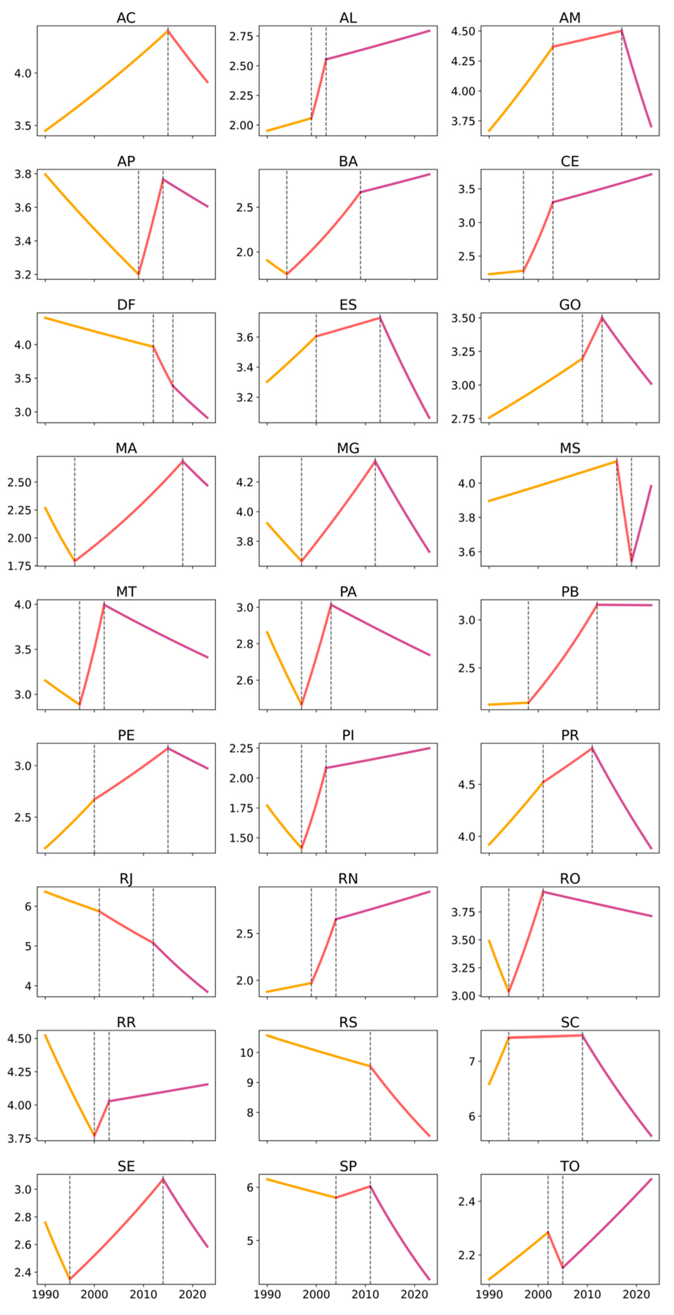 | Distrito Federal | 1990–2012 | −0.47 (−0.57 to −0.36) | <0.001 | 1990–2000 | 1.00 (0.63 to 1.37) | <0.001 |
