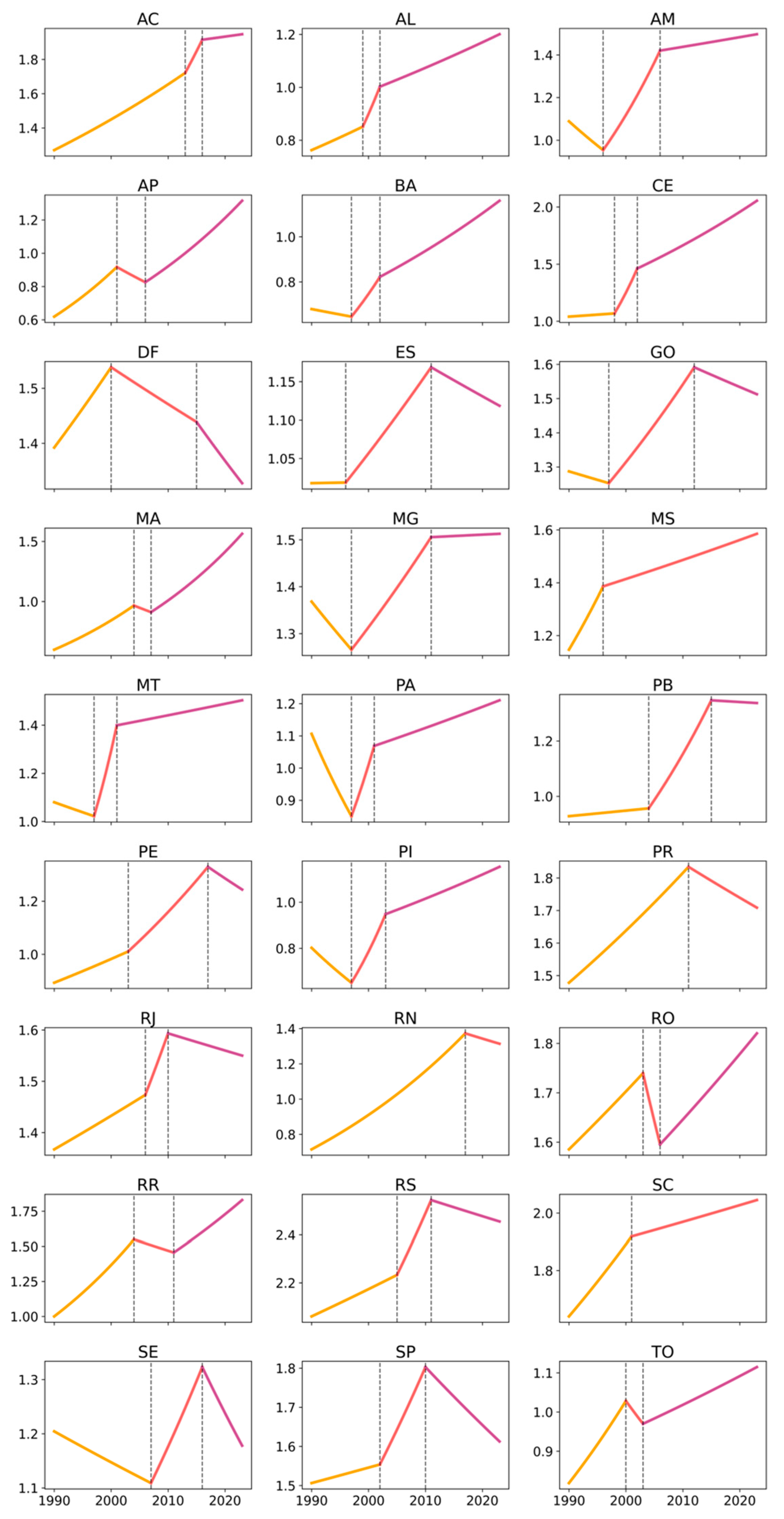 | Tocantins | 1990–2002 | 0.66 (0.38 to 0.95) | <0.001 | 1990–2000 | 2.30 (1.91 to 2.70) | <0.001 |