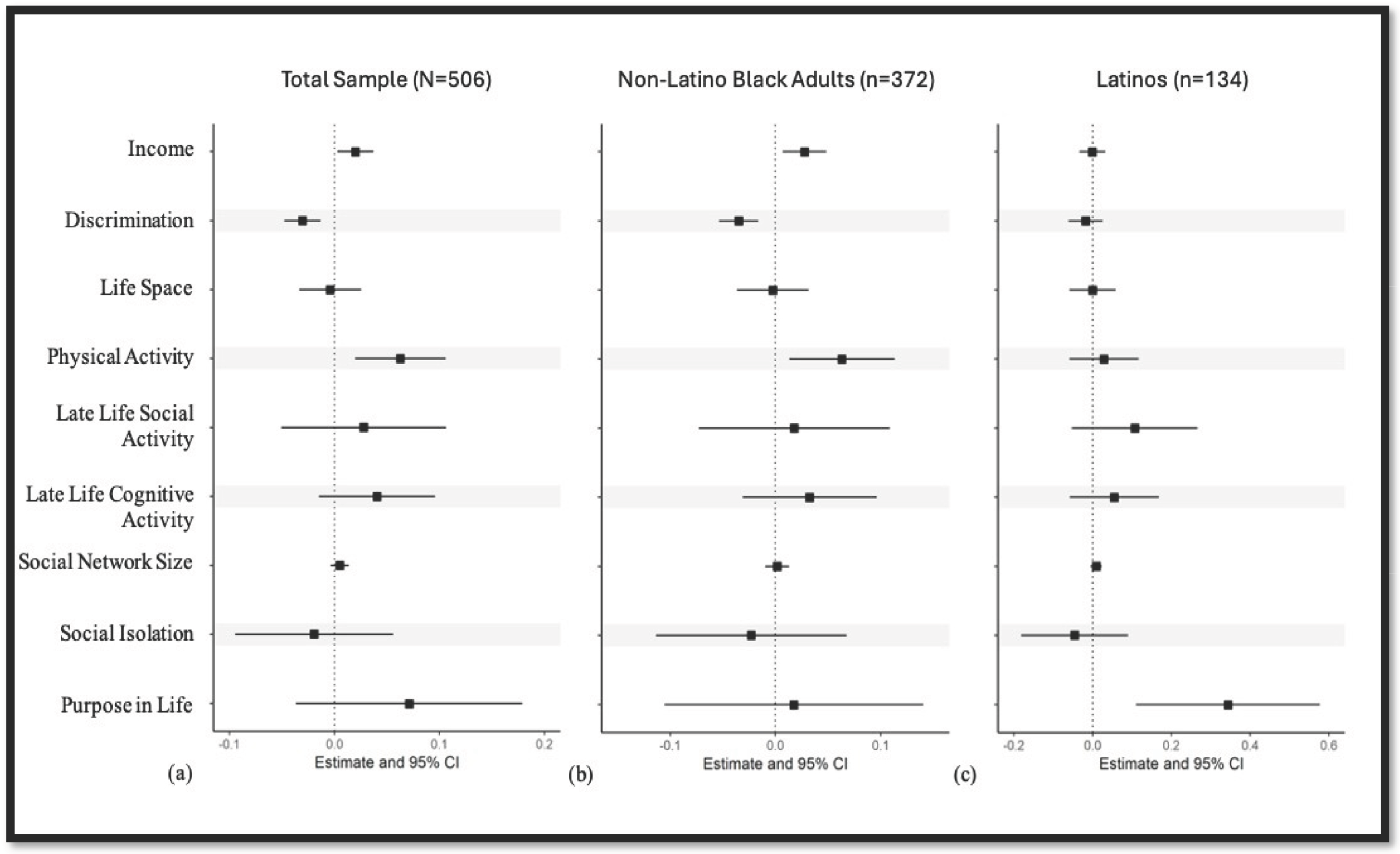 - Better neighborhood perceptions were associated with less discrimination and higher income for non-Latino Black older adults, while more purpose in life was related to better neighborhood perceptions among older Latinos.