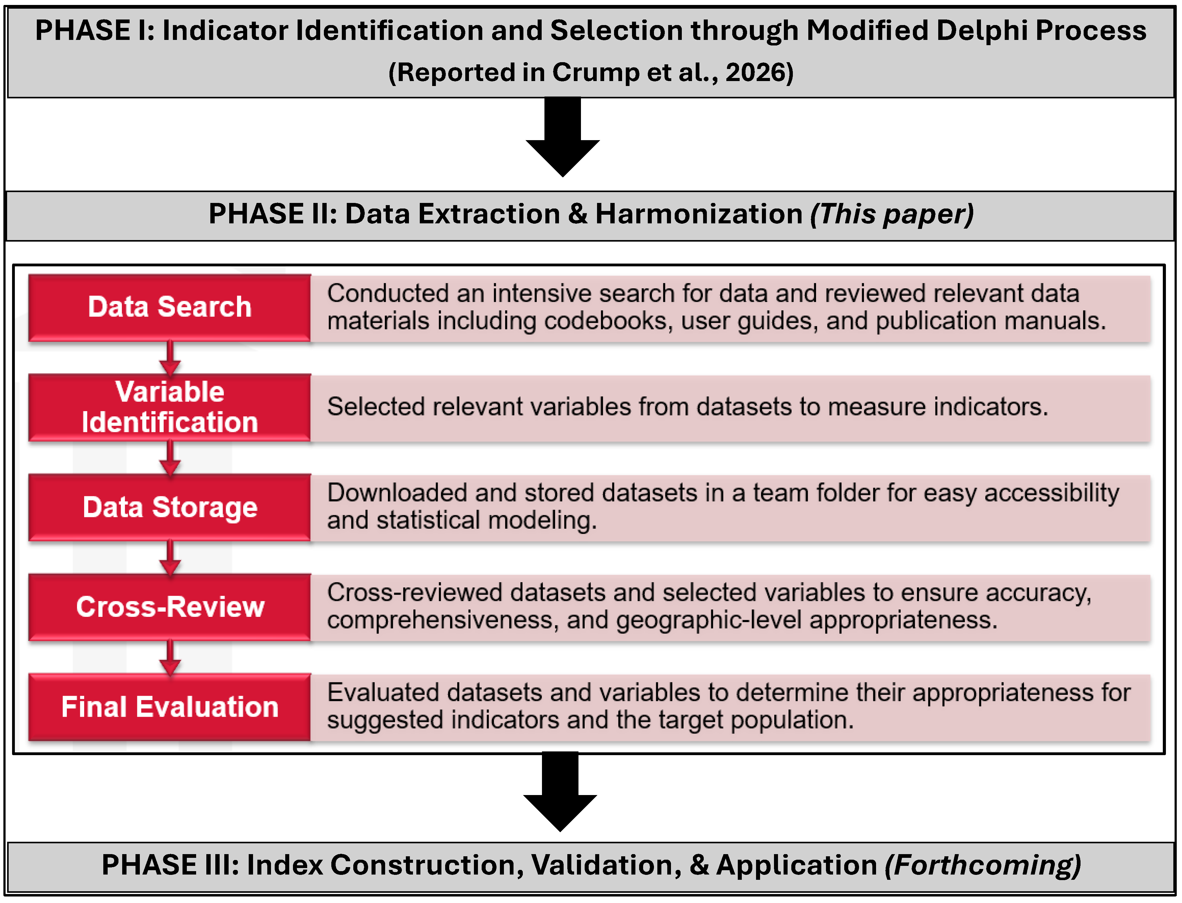 18]. Phase II focused on extracting and harmonizing geographic-level data through a five-step approach: (1) conducting a data search and reviewing relevant materials, (2) identifying variables to measure key indicators, (3) organizing and storing datasets, (4) cross-reviewing datasets for accuracy, and (5) evaluating datasets for their relevance to the proposed indicators and target populations. This paper specifically reports on Phase II, with particular emphasis on the methodological challenges encountered and the strategies used to address them during data extraction and harmonization. Phase III is forthcoming and will involve constructing, validating, and applying the finalized index to health outcomes.
