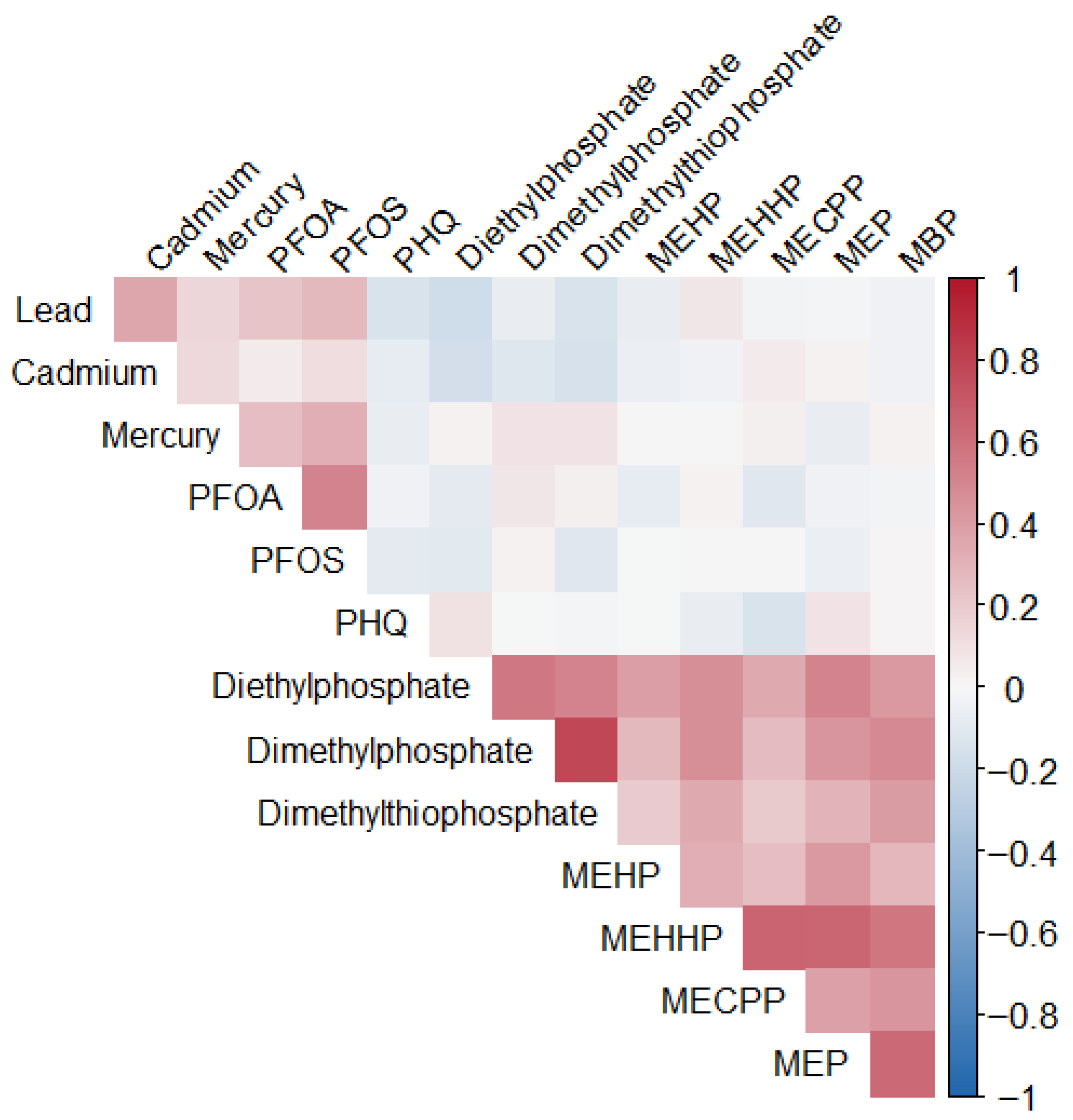 Biomarkers of per- and polyfluoroalkyl substances (PFAS), heavy metals, phthalate metabolites, and organophosphate metabolites were quantified by the National Center for Environmental Health (NCEH), Centers for Disease Control and Prevention (CDC), using standardized laboratory protocols implemented in the NHANES 2017–2018 cycle. All laboratory analyses were conducted at the CDC Division of Laboratory Sciences (Atlanta, GA, USA). Across all analyte classes, biological specimens were collected, processed, stored, and analyzed according to NHANES laboratory protocols. These procedures included standardized sample storage conditions, use of isotope-labeled internal standards, calibration with certified reference materials, and routine quality assurance and quality control measures such as reagent blanks, duplicate samples, and periodic reanalysis to ensure analytical precision and accuracy.