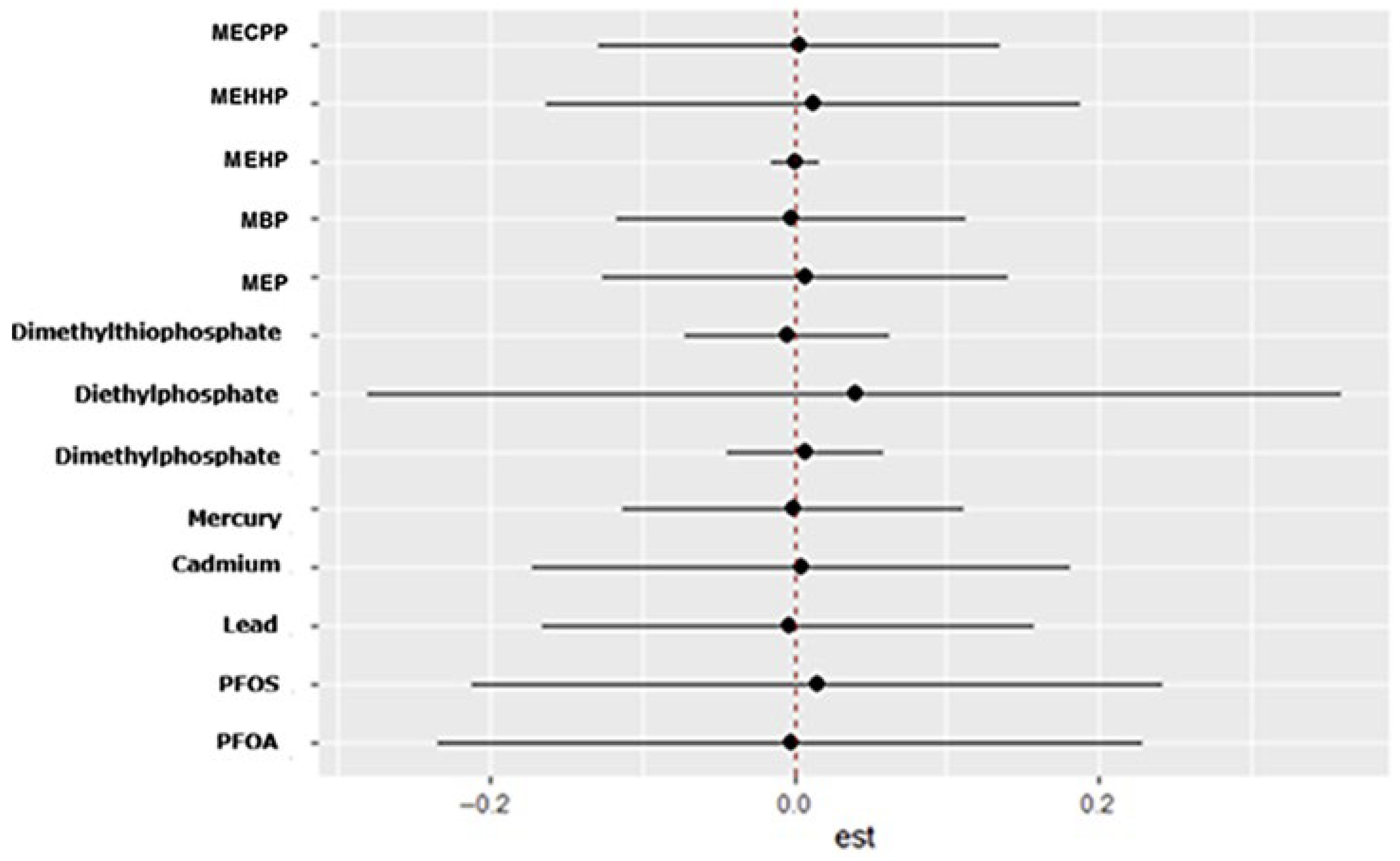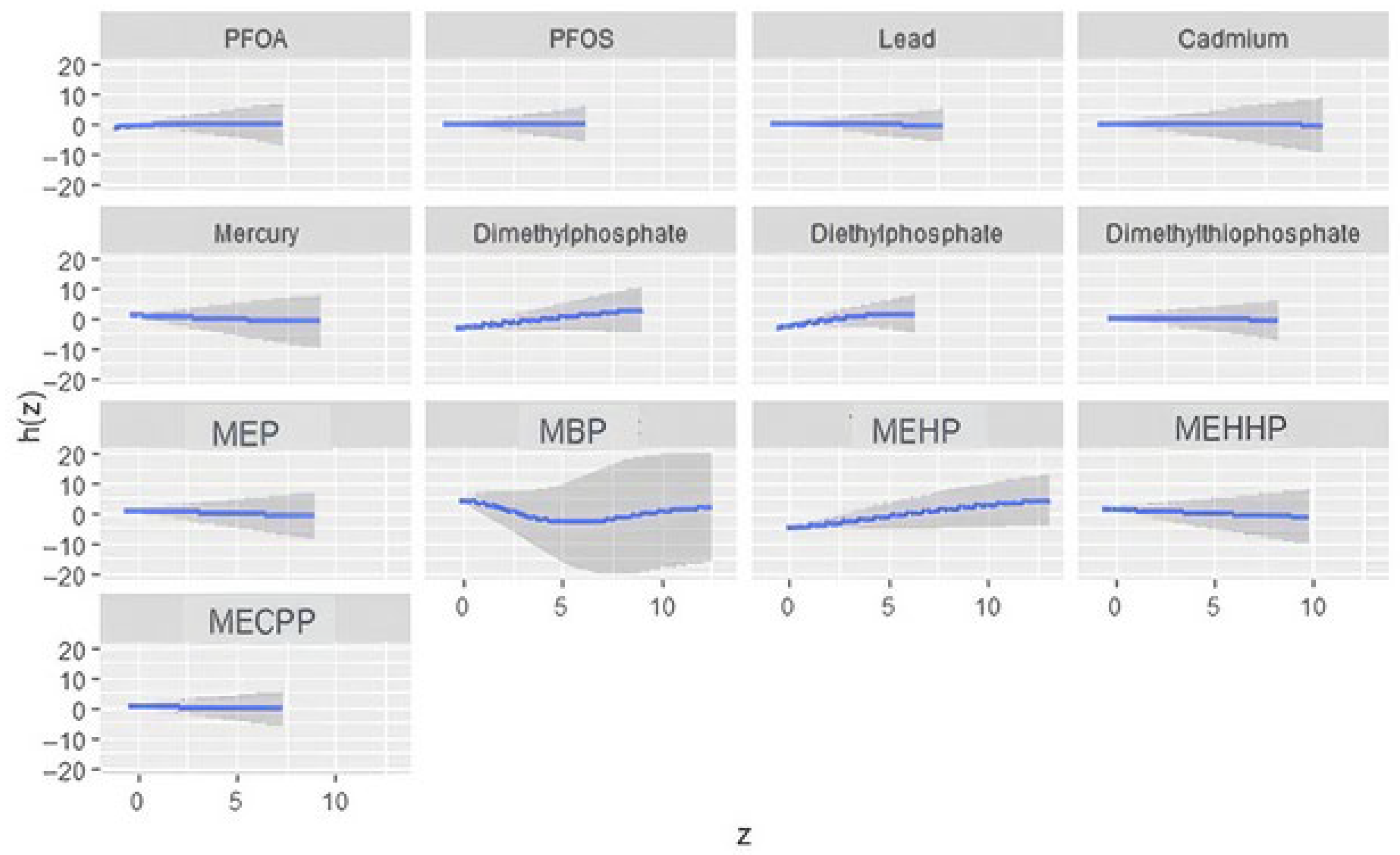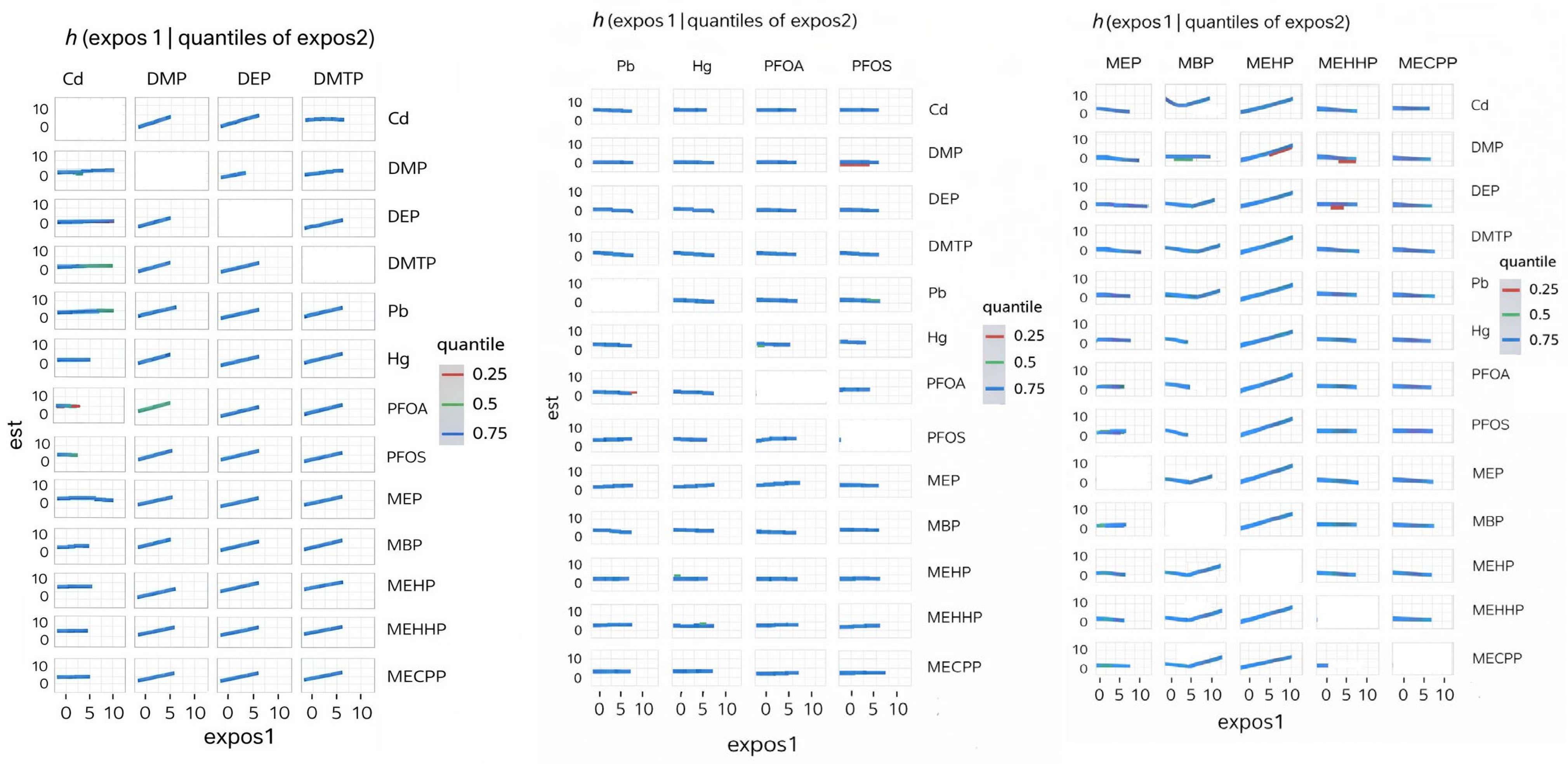 The bivariate and univariate exposure–response BKMR plots further suggest potential nonlinear or threshold effects for several metabolites, including DMP, MBP, and MEHP. Such patterns indicate that health risks may intensify once exposures exceed certain levels or when co-exposures interact synergistically. These nonlinearities may also explain why traditional regression models, which assume linearity, fail to detect associations for some exposures.
