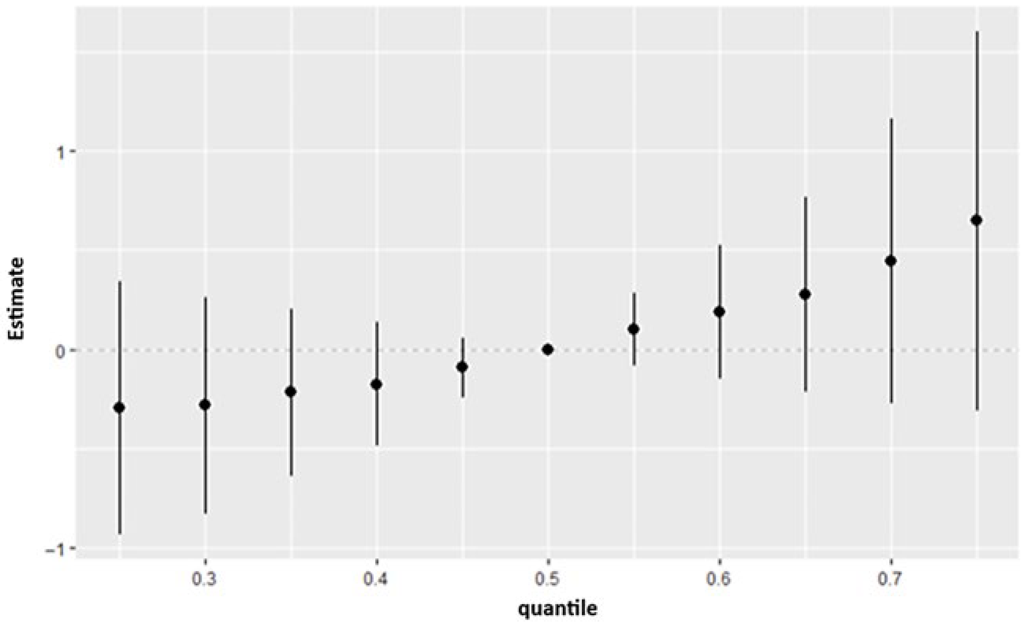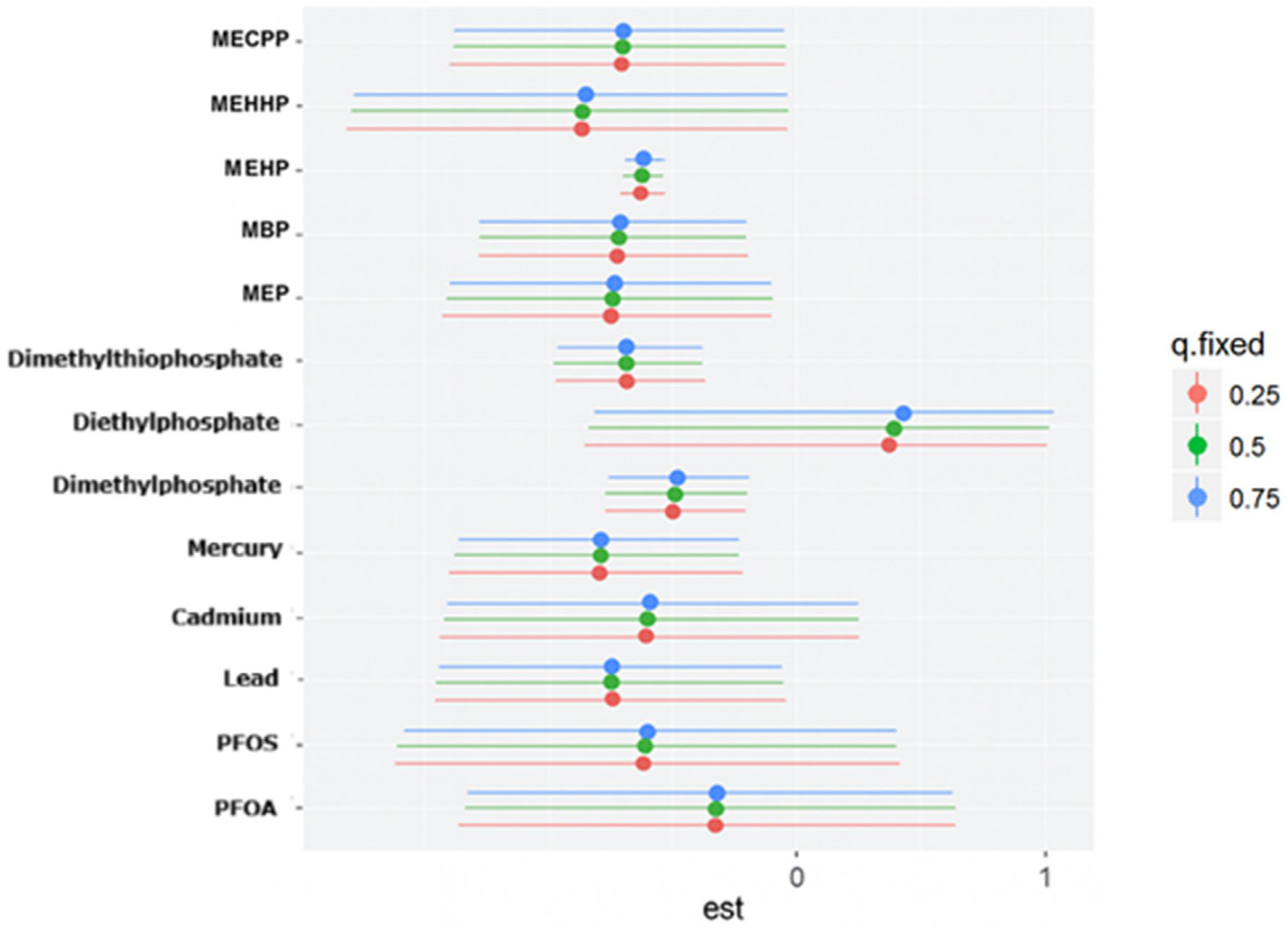 The overall exposure effect results showed that the combined mixture of PFAS, metals, phthalates, and organophosphate metabolites produced a consistent upward shift in depression risk across the higher quantiles of the outcome distribution. Although the credible intervals indicated some uncertainty, the pattern suggested that the joint burden of these chemicals may exert a stronger influence on depressive symptoms than any single exposure considered alone. This matches prior work which suggests that exposure to multiple pollutants including metals and PFAS cumulatively are associated with depression [