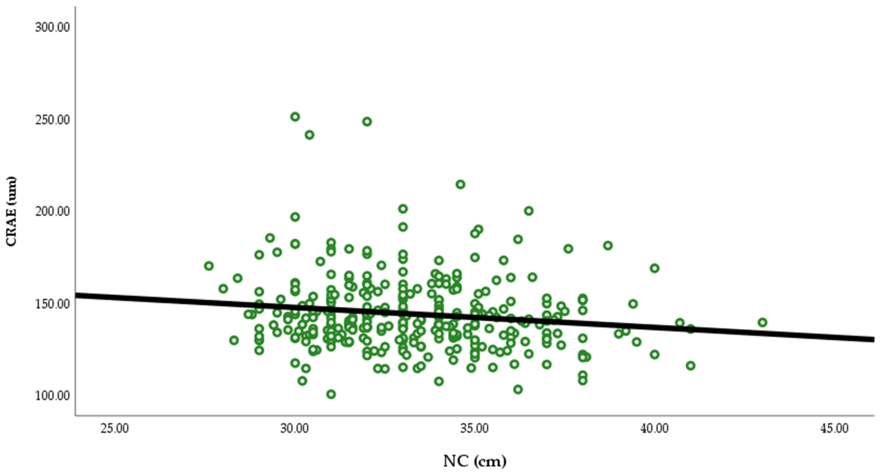| NC (cm) | r = −0.144 p = 0.009 | r = −0.144 p = 0.039 | r = −0.030 p = 0.585 |