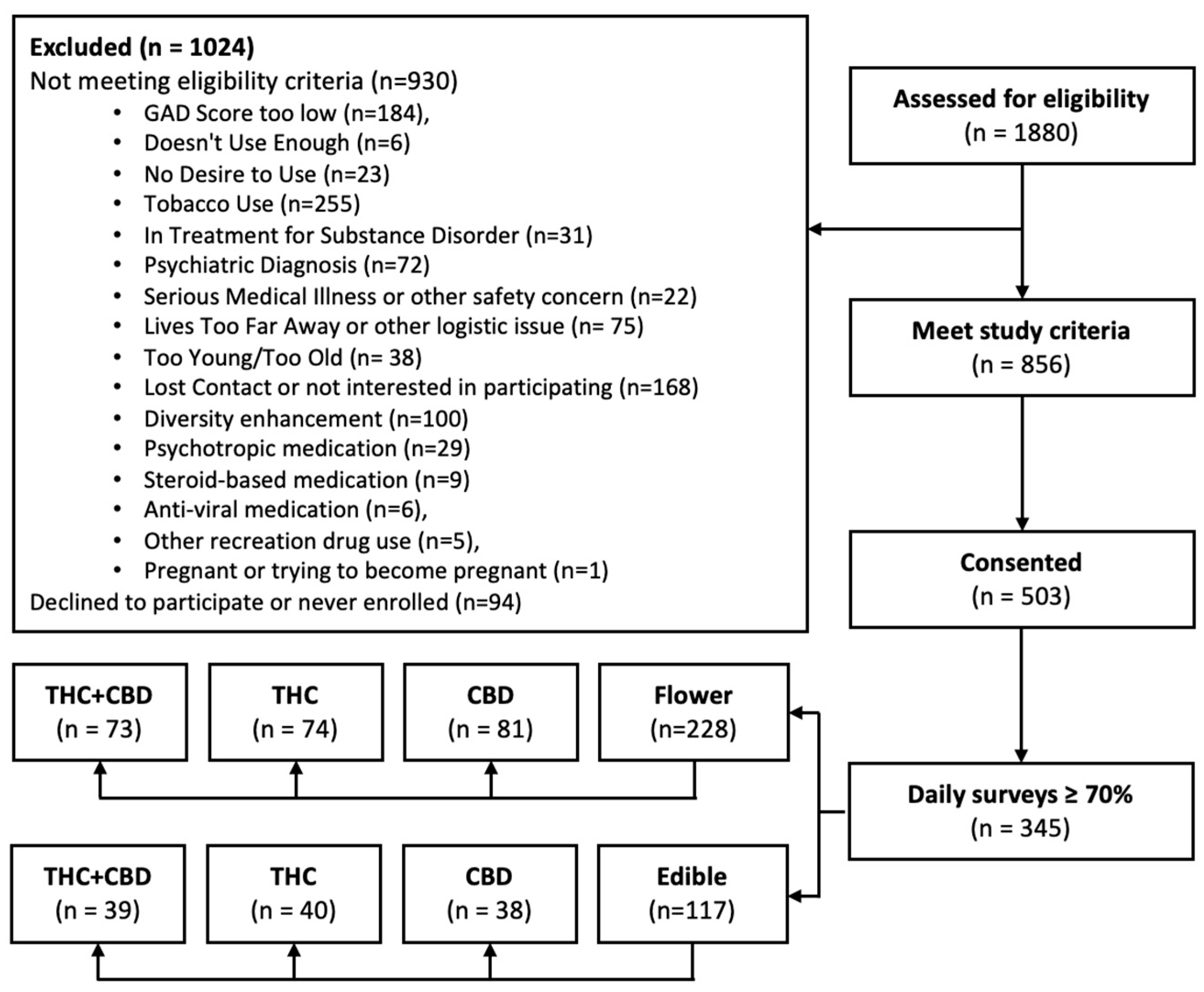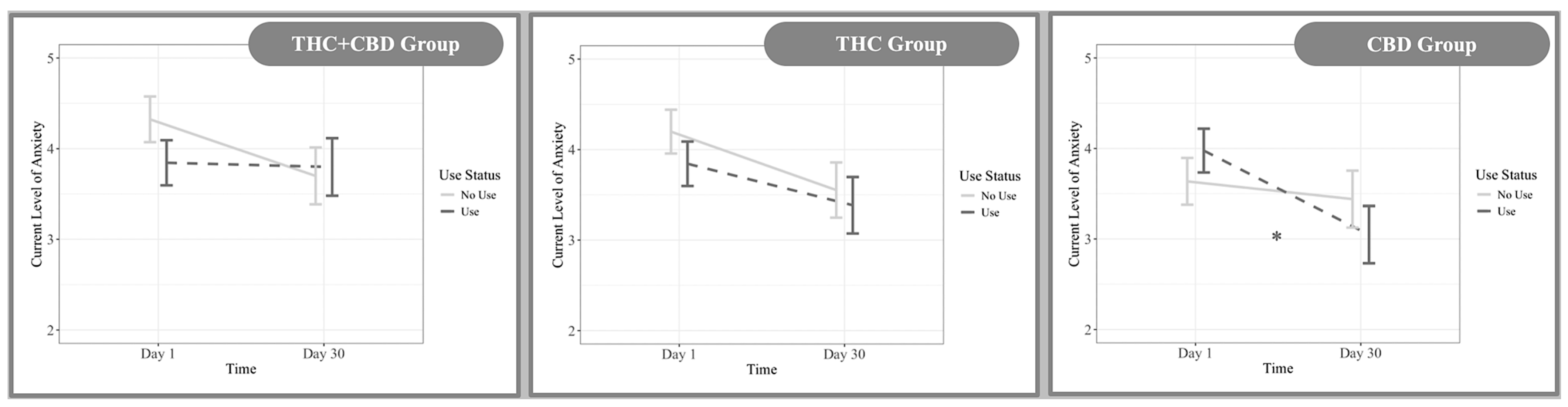 - This paper tracked 30-day daily anxiety alongside product use, comparing flower vs. edible cannabis and different cannabinoid contents (THC-dominant, CBD-dominant, and THC + CBD).