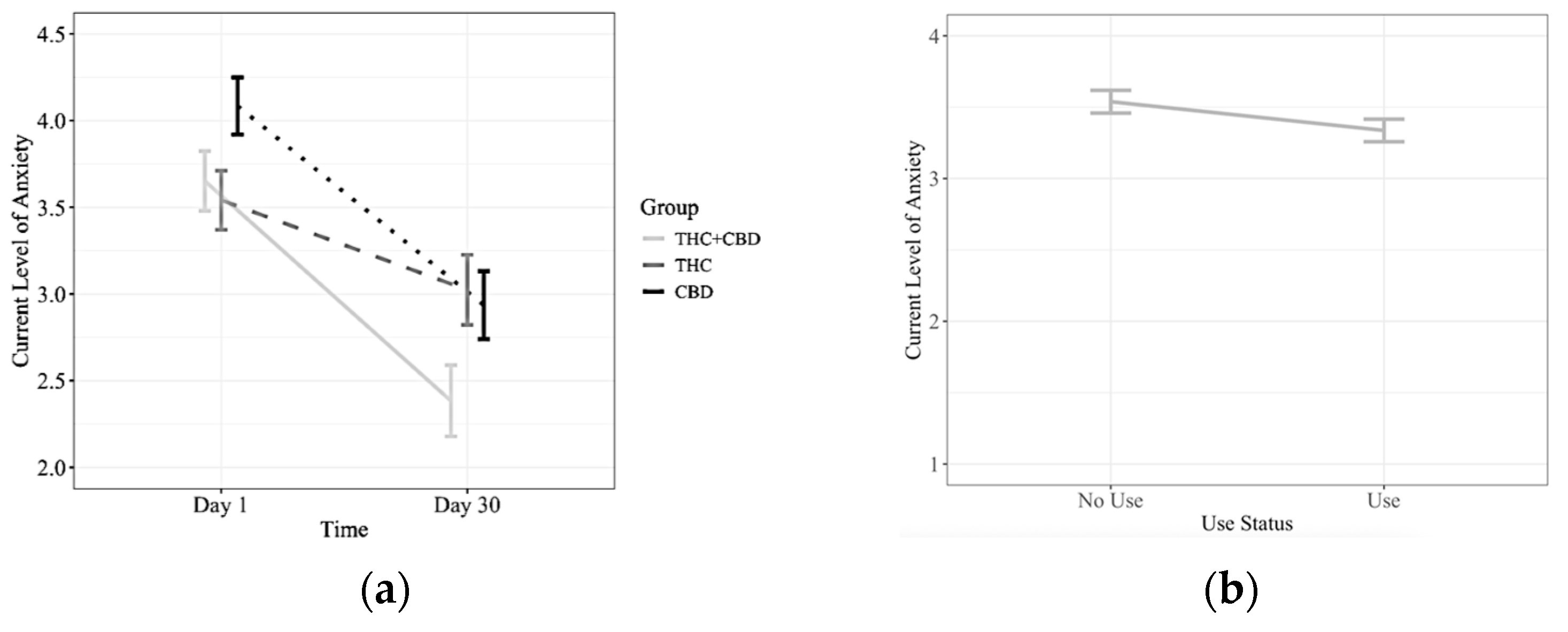 - Bidwell, L.C.; Martin-Willett, R.; Skrzynski, C.; Lisano, J.; Ortiz Torres, M.; Giordano, G.; Hutchison, K.E.; Bryan, A.D. Acute and extended anxiolytic effects of cannabidiol in cannabis flower: A quasi-experimental ad libitum use study. Cannabis Cannabinoid Res. 2024, 9, 1015–1027. [Google Scholar] [CrossRef]