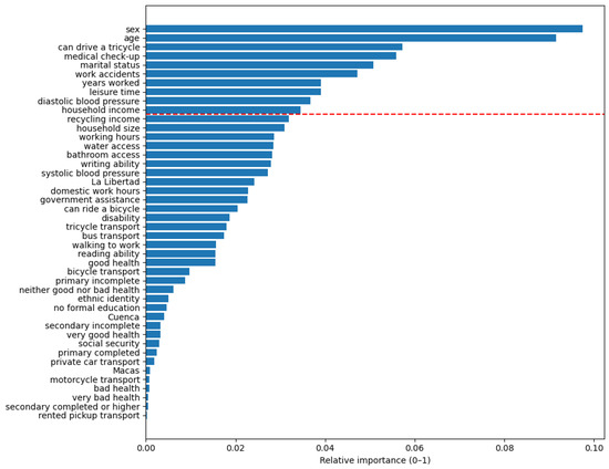 Among the variables with the greatest contribution to the model were sex and age, followed by other sociodemographic factors such as mobility ability (knowing how to drive a tricycle), marital status, leisure time, and household income. Variables related to working conditions, including years of employment and the occurrence of workplace accidents, also contributed to the classification process. Finally, variables related to health and access to healthcare, such as attendance at medical check-ups and diastolic blood pressure, were identified as relevant predictors.