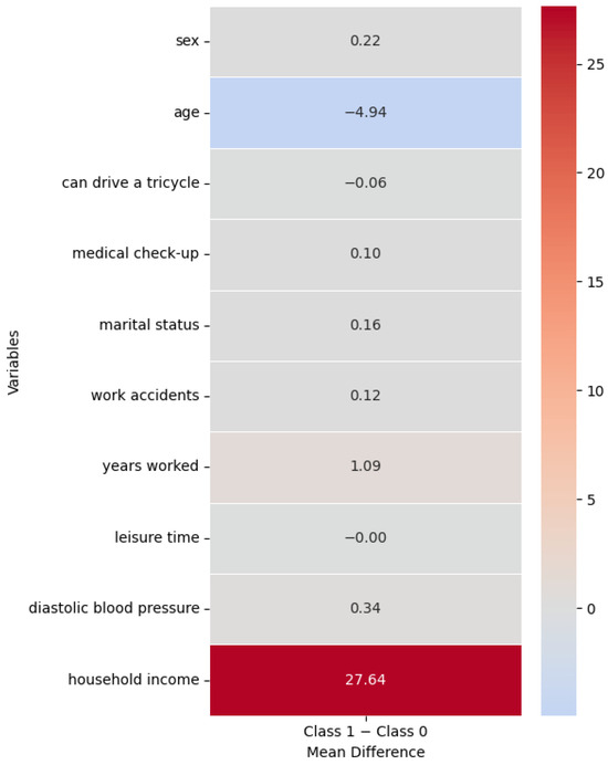 To further support the interpretation of the most relevant predictors, heatmaps of class-wise mean differences were constructed using only the ten most influential variables identified by the selected model. These heatmaps provide a descriptive visualization of how key characteristics differ between Class 0 and Class 1. For each variable, mean values were calculated separately for Class 0 and Class 1, and the difference between classes (Class 1 − Class 0) was computed. For numerical variables, this difference reflects both the magnitude and direction of the contrast between classes. For binary categorical variables, such as sex (coded as 0 = male and 1 = female), the mean represents the proportion of individuals belonging to category 1. A diverging color scale centered at zero was used to facilitate a clear and rapid identification of contrasts between groups. These visualizations are descriptive in nature and do not fully explain the model’s predictive behavior, which arises from complex multivariate interactions.