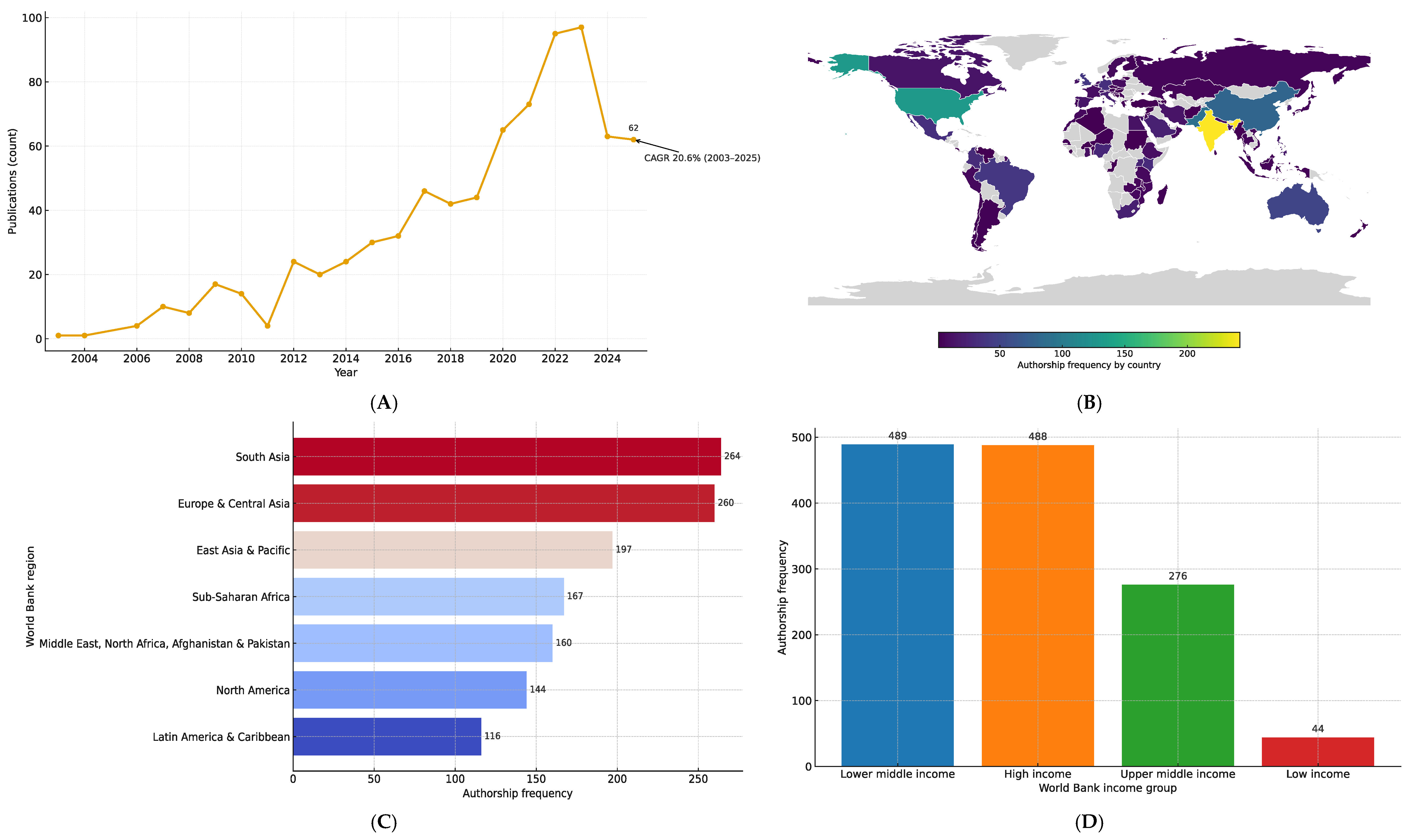 Figure 1C). In terms of income classification, high- and upper-middle-income countries together accounted for the largest share of publications, while low-income countries remained underrepresented. However, low- and middle-income countries, considered as a single group, exhibited the highest overall frequency when compared with each income category individually (n = 489) (