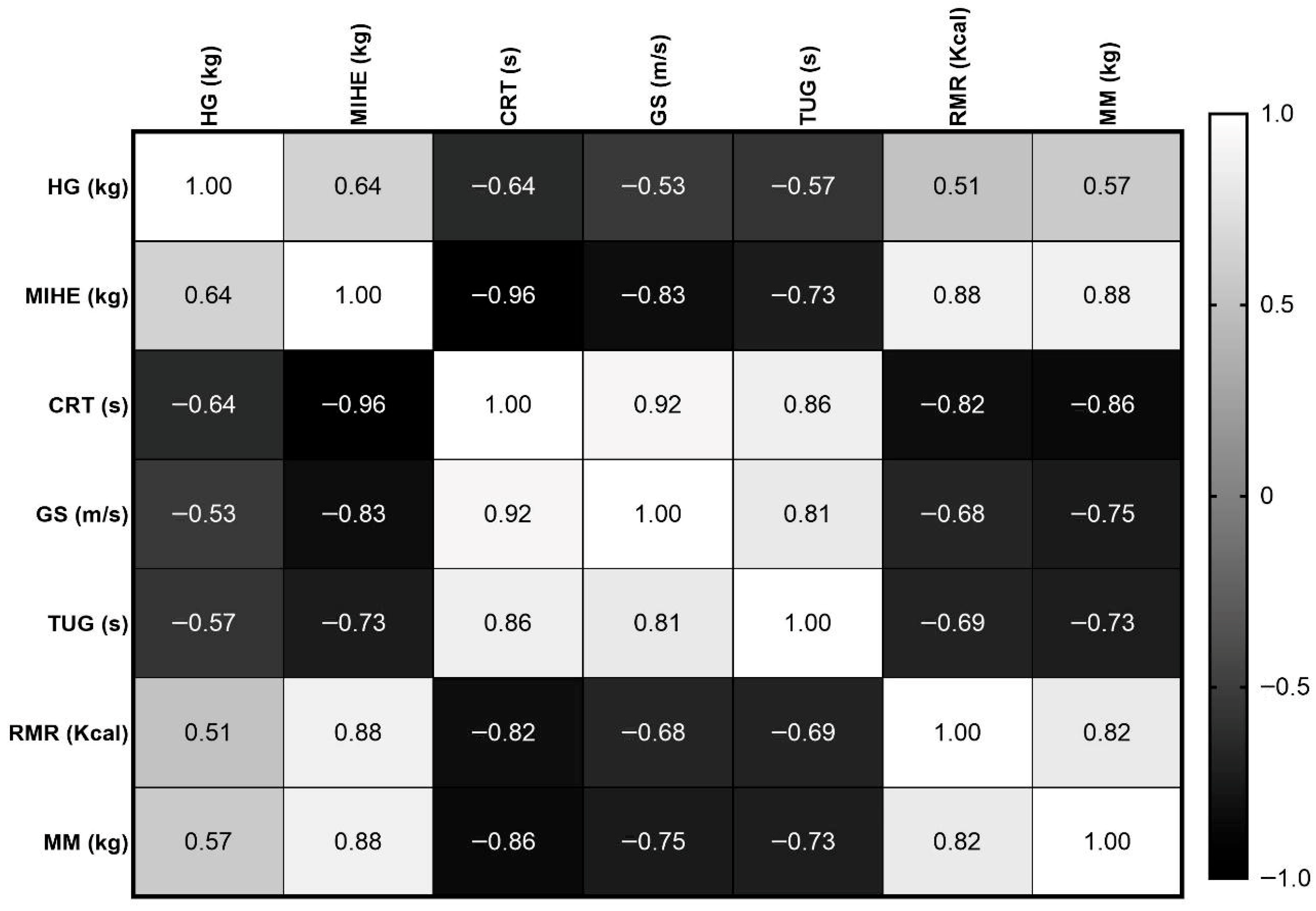 Notably, MIHE showed strong associations with the chair-rise test (CRT), GS, and TUG outcomes. The large effect size observed for MIHE (d = 1.13) is aligned with prior literature indicating that proximal and lower limb strength often demonstrate stronger relationships with mobility outcomes than HG alone [