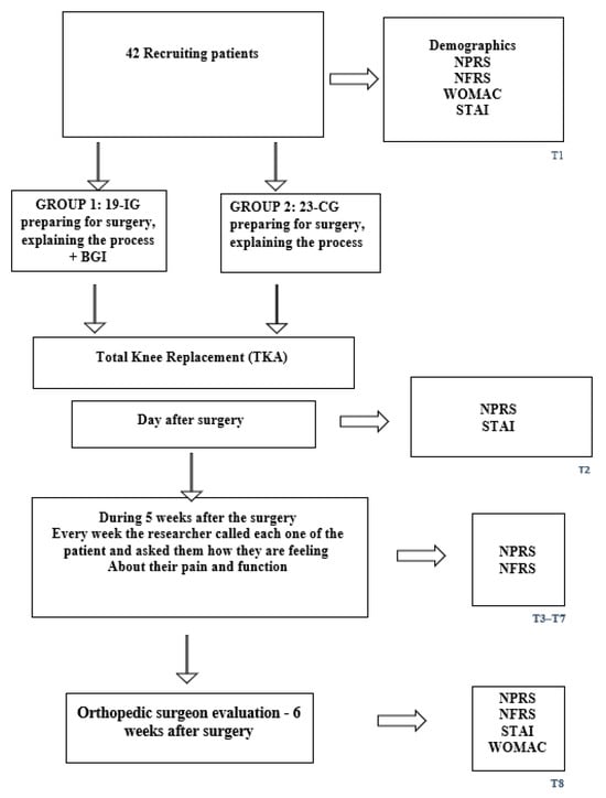 Data Collection Schedule: The measures taken in T1 include a demographic questionnaire, NPRS pain intensity (0–10; 0 = no pain, 10 = unbearable pain), NFRS (0–10; 0 = no need for help, 10 = need help at all functions), WOMAC, and STAI. The measures taken in T2 were NPRS and STAI. The measures taken in T3–T7 are NPRS and NFRS. The measures taken in T8 were NPRS, NFRS, STAI, and WOMAC (Figure 1). To minimize participant burden and accommodate postoperative clinical constraints, outcome measures were collected at different time points according to feasibility. All outcomes (NPRS, NFRS/WOMAC, and STAI) were assessed at baseline (T1) and at the 5–6-week postoperative follow-up (T8) when a complete in-person evaluation was possible. On the first postoperative day (T2), only NPRS and STAI were collected, as patients were in the immediate recovery phase and unable to complete longer functional questionnaires. During T3–T7, data were collected by telephone, allowing administration of NPRS and NFRS but not the longer WOMAC or STAI instruments. This schedule ensured consistent monitoring of pain and function while respecting clinical limitations and patient comfort.