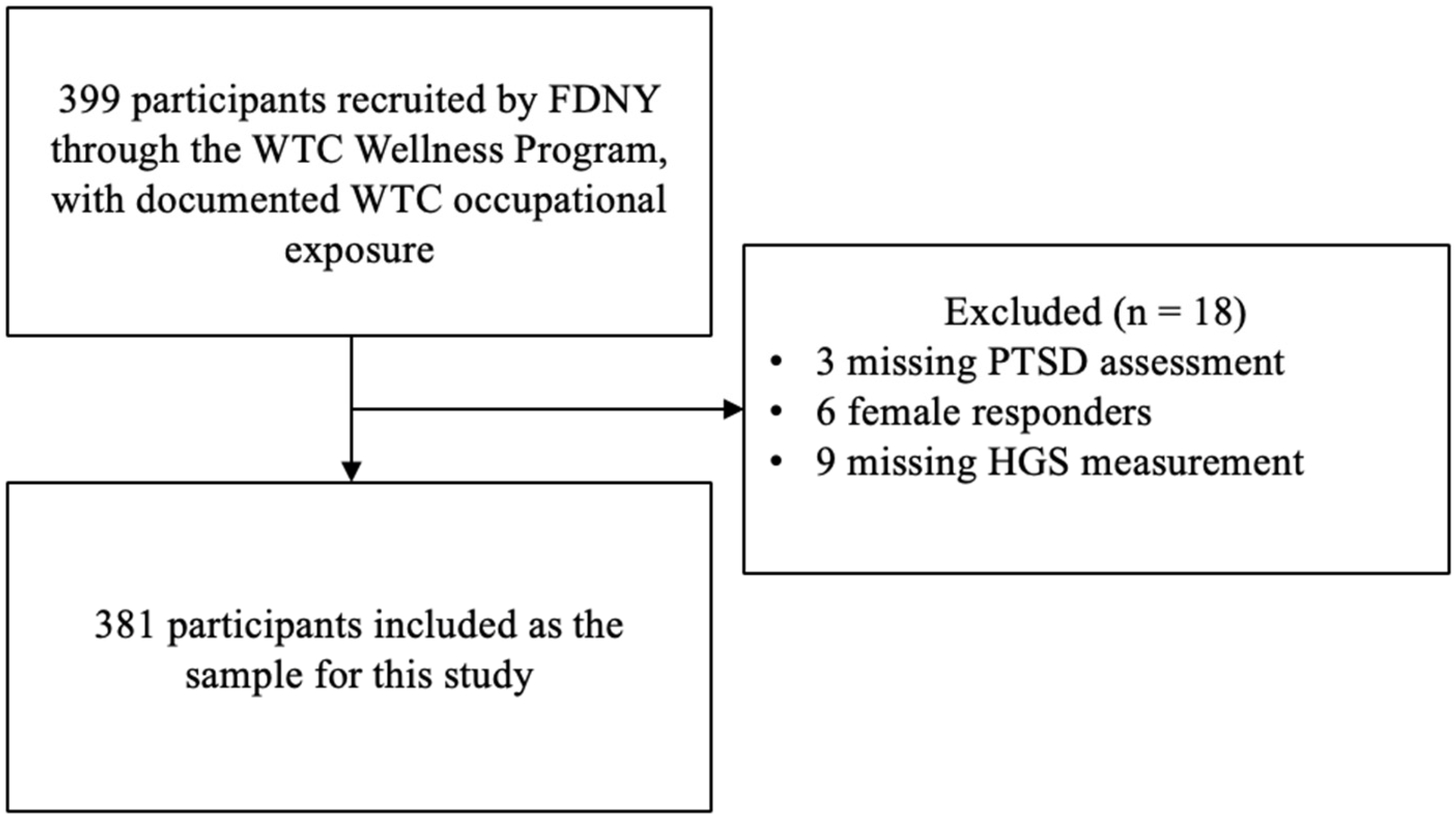 - Mukherjee, S.; Clouston, S.; Kotov, R.; Bromet, E.; Luft, B. Handgrip Strength of World Trade Center (WTC) Responders: The Role of Re-Experiencing Posttraumatic Stress Disorder (PTSD) Symptoms. Int. J. Environ. Res. Public Health 2019, 16, 1128. [Google Scholar] [CrossRef] [PubMed] [PubMed Central]
