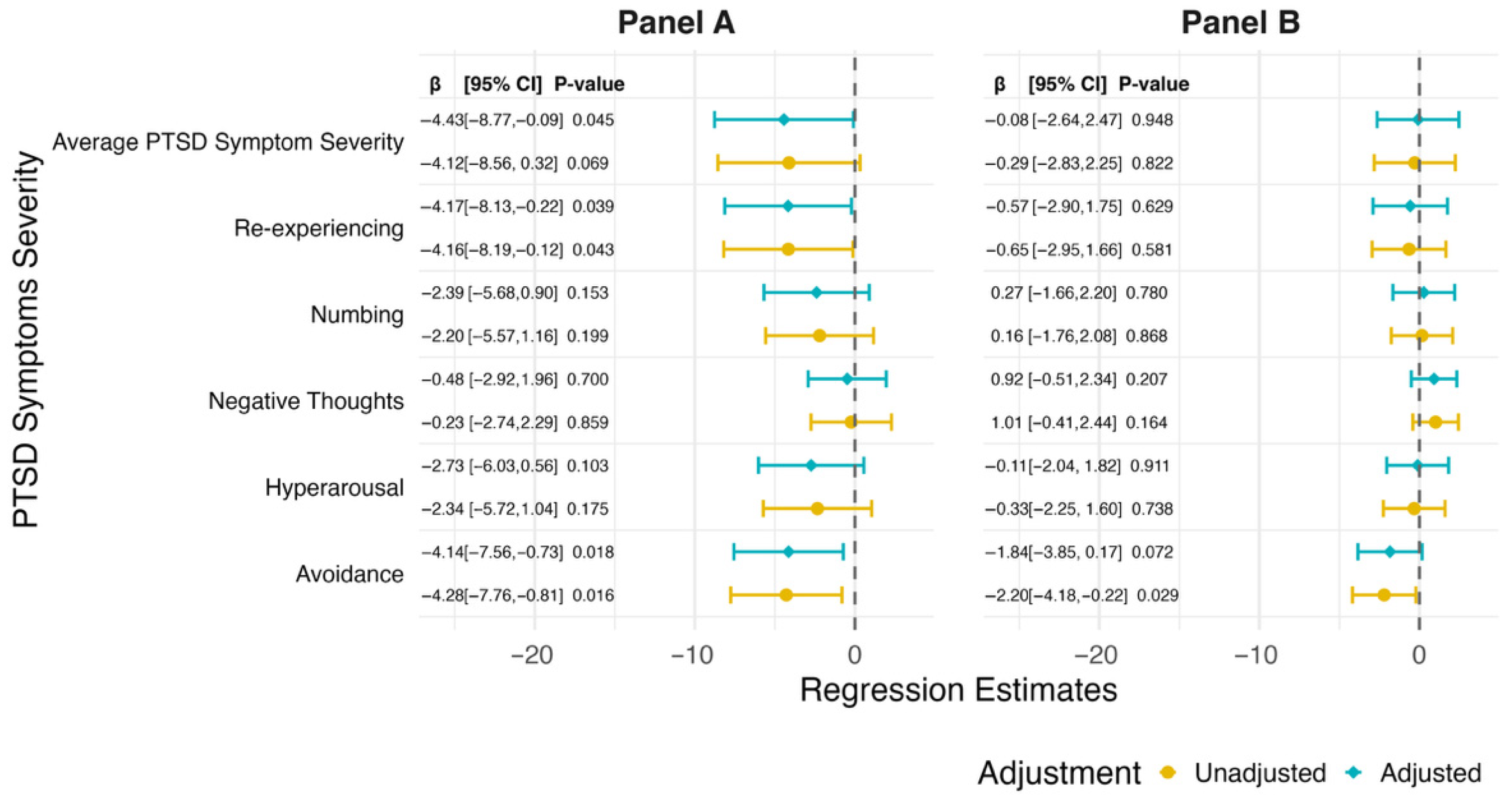 | Average PTSD Symptom Severity | 1.4 (0.3) | 1.9 (0.3) | 1.2 (0.2) |
