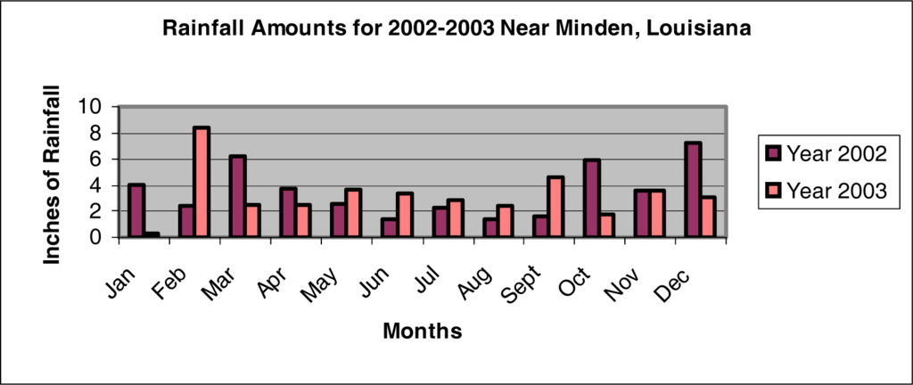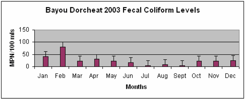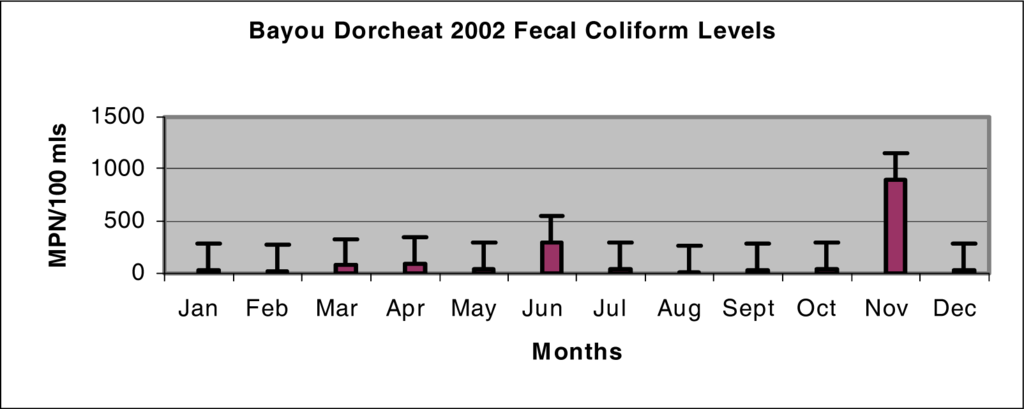 A comparison of the fecal coliform level data collected from Bayou Dorcheat for the years of 2002 and 2003 was done. Measurements regarding rainfall levels for the city of Minden, LA located within a one mile radius of Bayou Dorcheat located in north Louisiana were retrieved from the Louisiana Office of State Climatology [