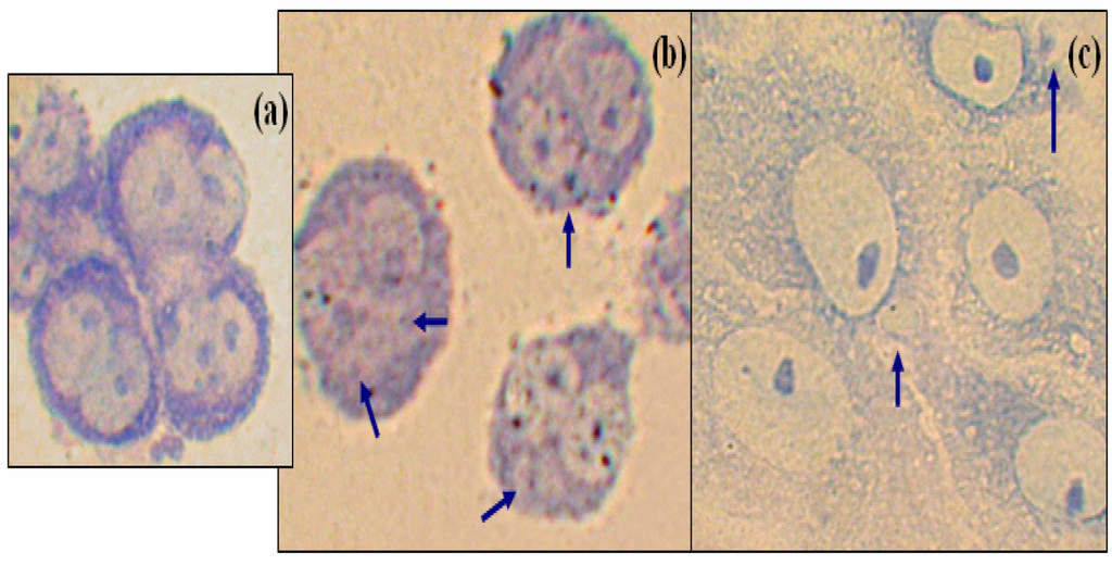 (a) Control cells 24h following the addition of Cytochalasin B showing binucleated cells, (400X), (b) MN in binucleated cells treated by Domoic acid, (100 ng/ml); (c) MN in mononucleated cells treated by okadaic acid, (60 ng/ml). Cells are stained with Giemsa (arrows indicate micronuclei)