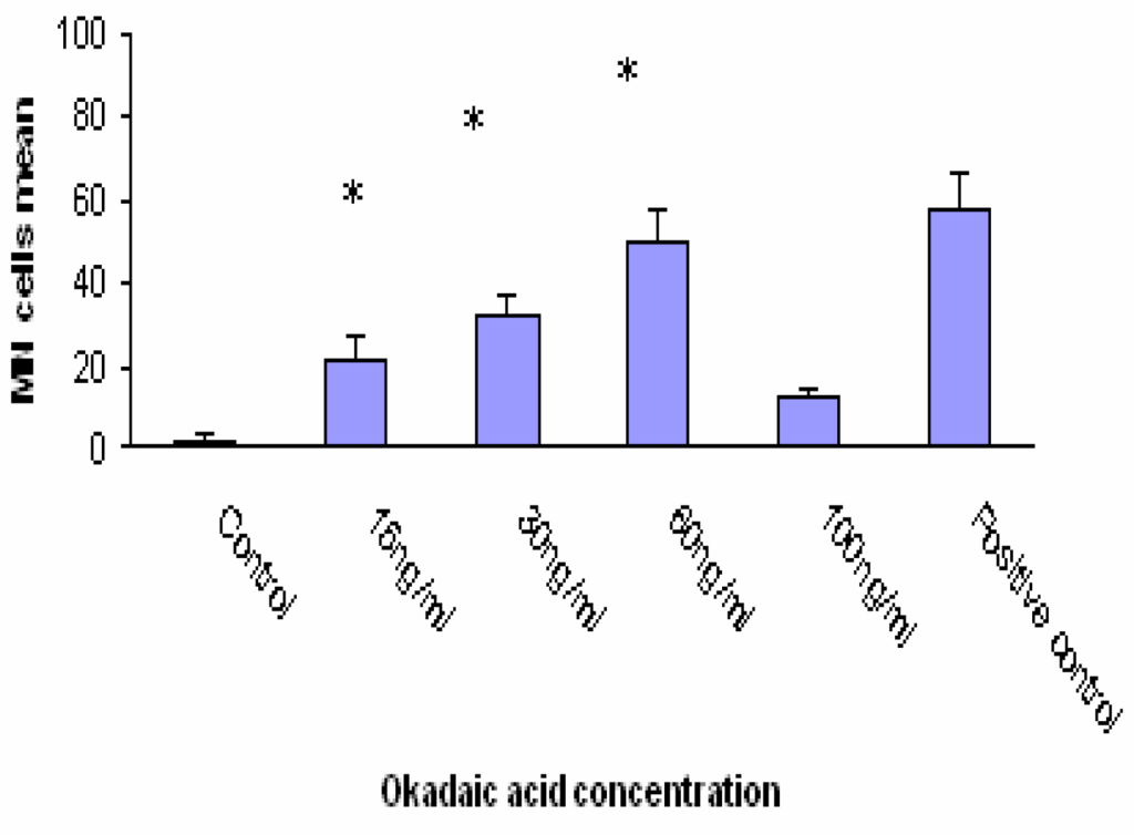 Our results showed that at OA concentrations of 15, 30 and 60 ng/ml the frequency of MN significantly increased in Caco-2 cells. However, the concentration of 100 ng/ml decreased the incidence of MN in cells to about 13%. This fact has to be attributed to OA cytotoxicity because this concentration induced apoptosis in Caco-2 cells as previously shown [19]. The reduction in viable cell number reflects apoptotic cell death. Traore et al. [19] and Rossini et al. [20] have proved that OA induces apoptosis in mammalian cells and specifically in human cancer cells [19–21] suggesting that the apoptosis induced by OA might be considered as a response of Caco-2 cells to this marine toxin, occurring at high concentrations. At concentrations of OA up to 15 ng/ml apoptosis is very rare.