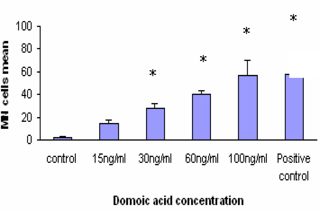 Our data are in line with recent finding of Rosefort et al. [26] who showed that the aneugens diethylstilbestrol, griseofulvin, and vincristine sulphate, in very similar concentration range, increased MN frequencies in mononucleated and binucleated cells, whilst the clastogens mitomycin C (500 ng/ml), bleomycin, and doxorubicin, increased MN frequency only in binucleates [26]. Thus Domoic acid should rather be classified as a clastogenic agent.
