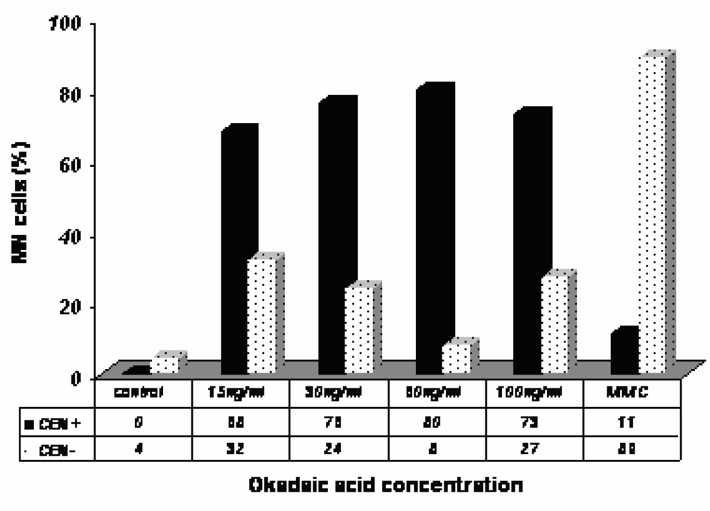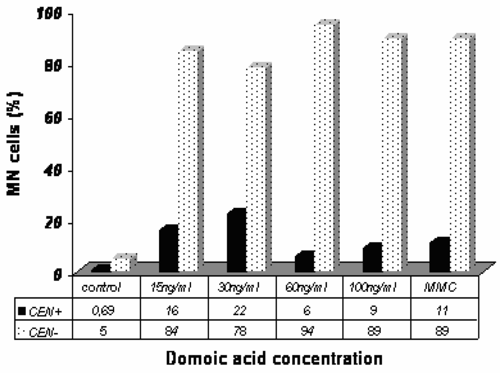 The FISH analysis showed that MMC induced mainly MN containing acentric fragments rather than whole chromosomes [15], in contrast to okadaic acid but similarly to domoic acid.