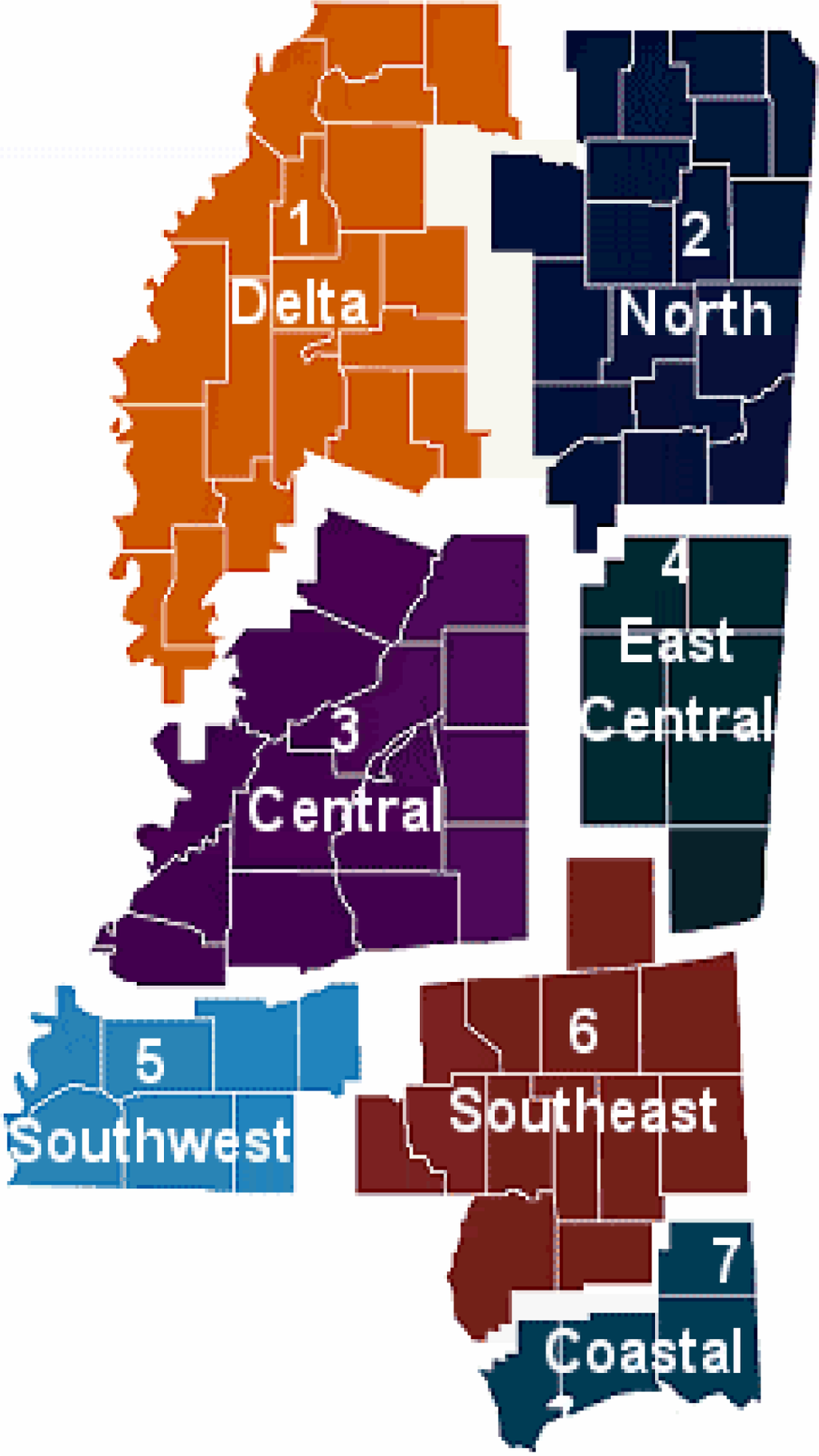 The State of Mississippi is comprised of 82 counties and 102 acute care hospitals. Figure 1 presents a demographic view of Mississippi, utilizing the Mississippi State Department of Health’s seven Trauma Care Region designations. These designations are commonly used in research efforts and descriptive statistics in the State of Mississippi to provide a framework for discussions about various issues such as the State’s health status, emergency services, hospitals and disaster preparedness efforts. Therefore, these designations were used in this study as reference points for the investigation and description of the preparedness of hospitals for managing victims of a terrorist attack involving chemical or biological weapons of mass destruction.